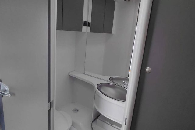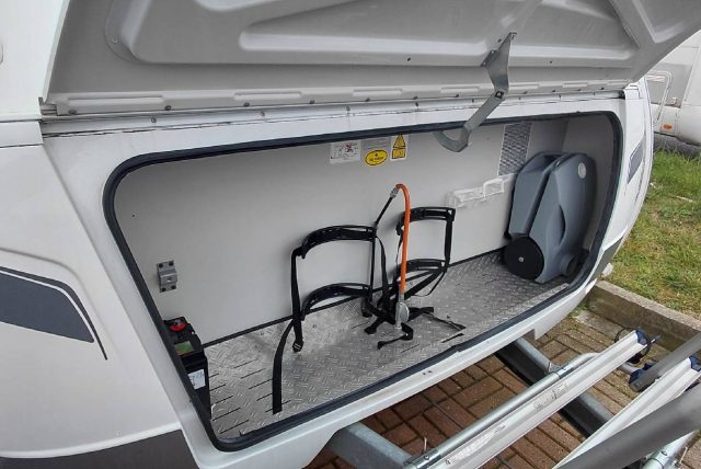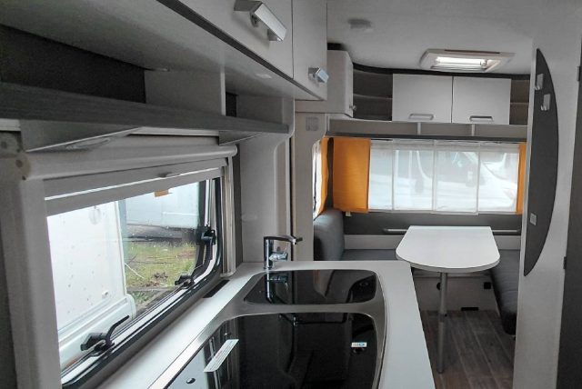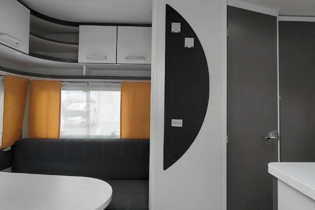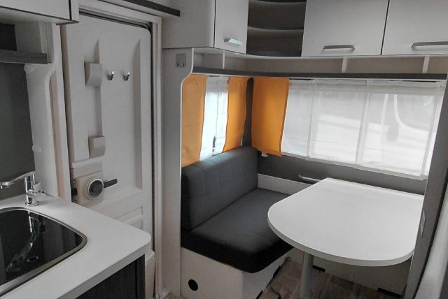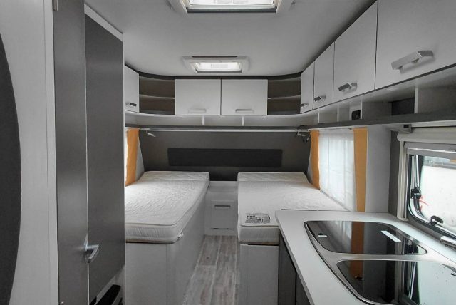 Caravan con dinette trasformabile in letto matrimoniale in coda, bagno e cucina con frigno nella zona centrale, letti singoli gemelli nella parte anteriore.