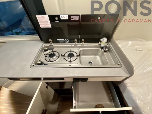 Dinette confortevole con sedili guida girevoli e tavolo con prolunga ruotabile, blocco cucina con piano cottura a due fuochi e frigorifero laterale a colonna con scomparto freezer.
