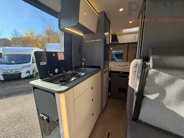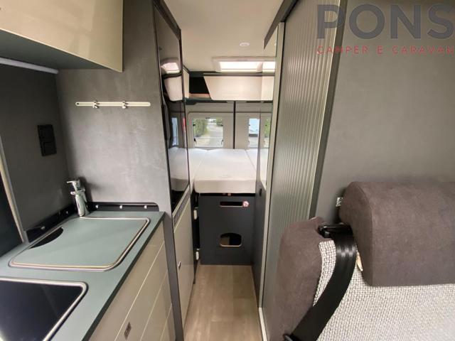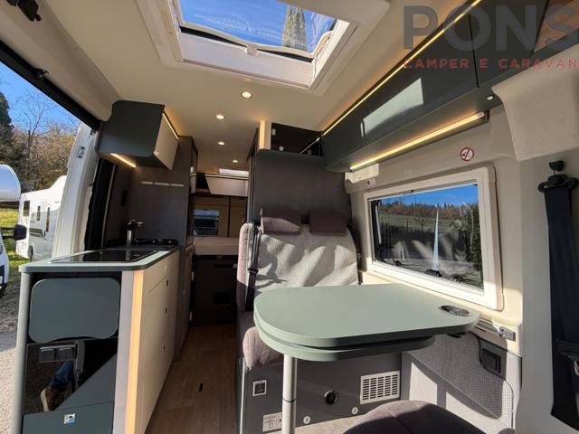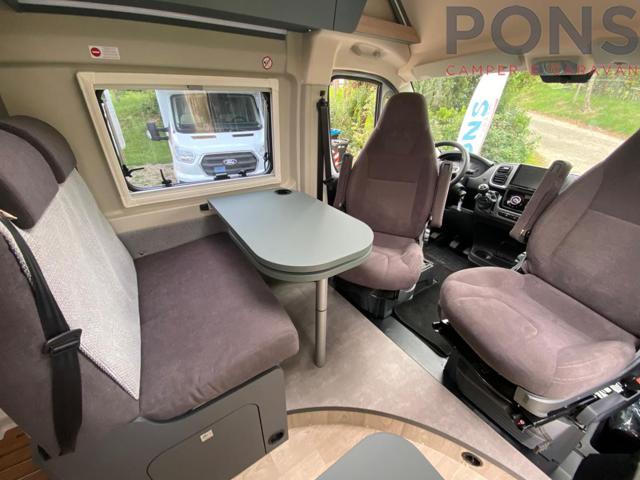 L'allestimento interno si configura con una luminosa dinette con sedili cabina girevoli e tavolo con piano supplementare orientabile.