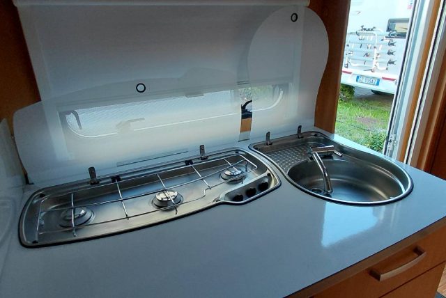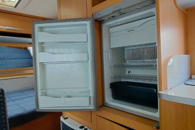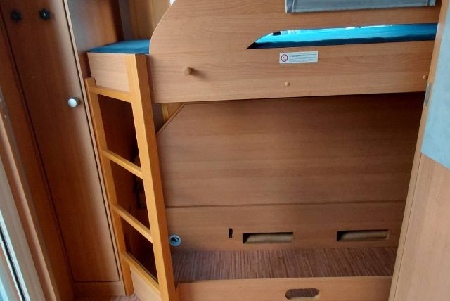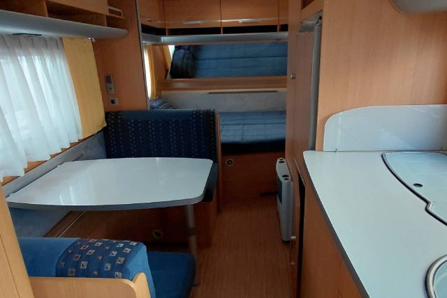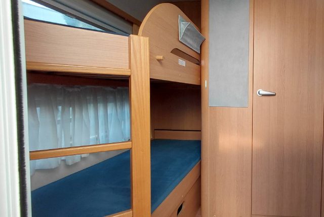 Caravan con letto matrimoniale anteriore, dinette classica trasformabile in letto matrimoniale nella zona centrale con bagno e cucina, letti singoli a castello posteriori.