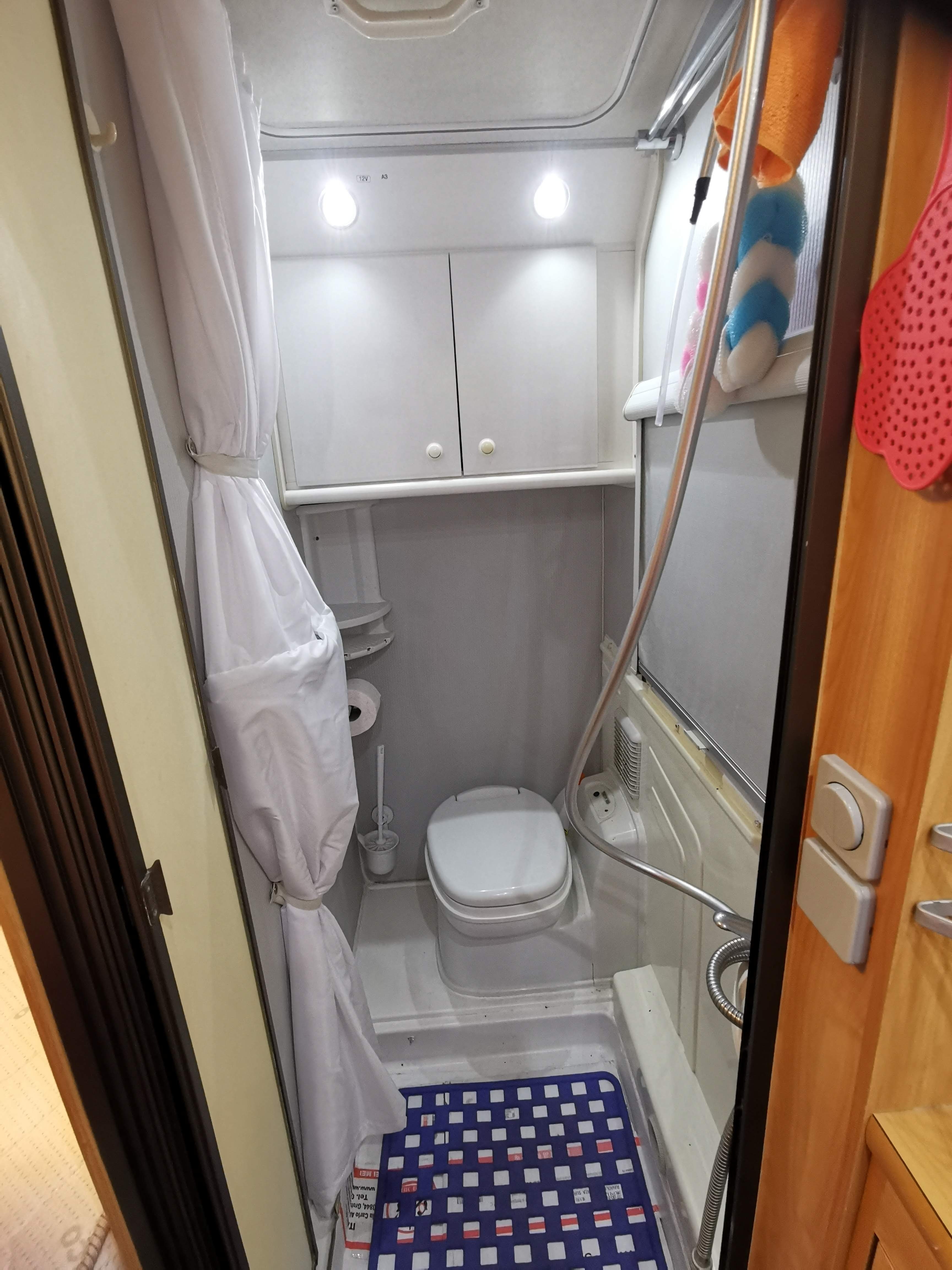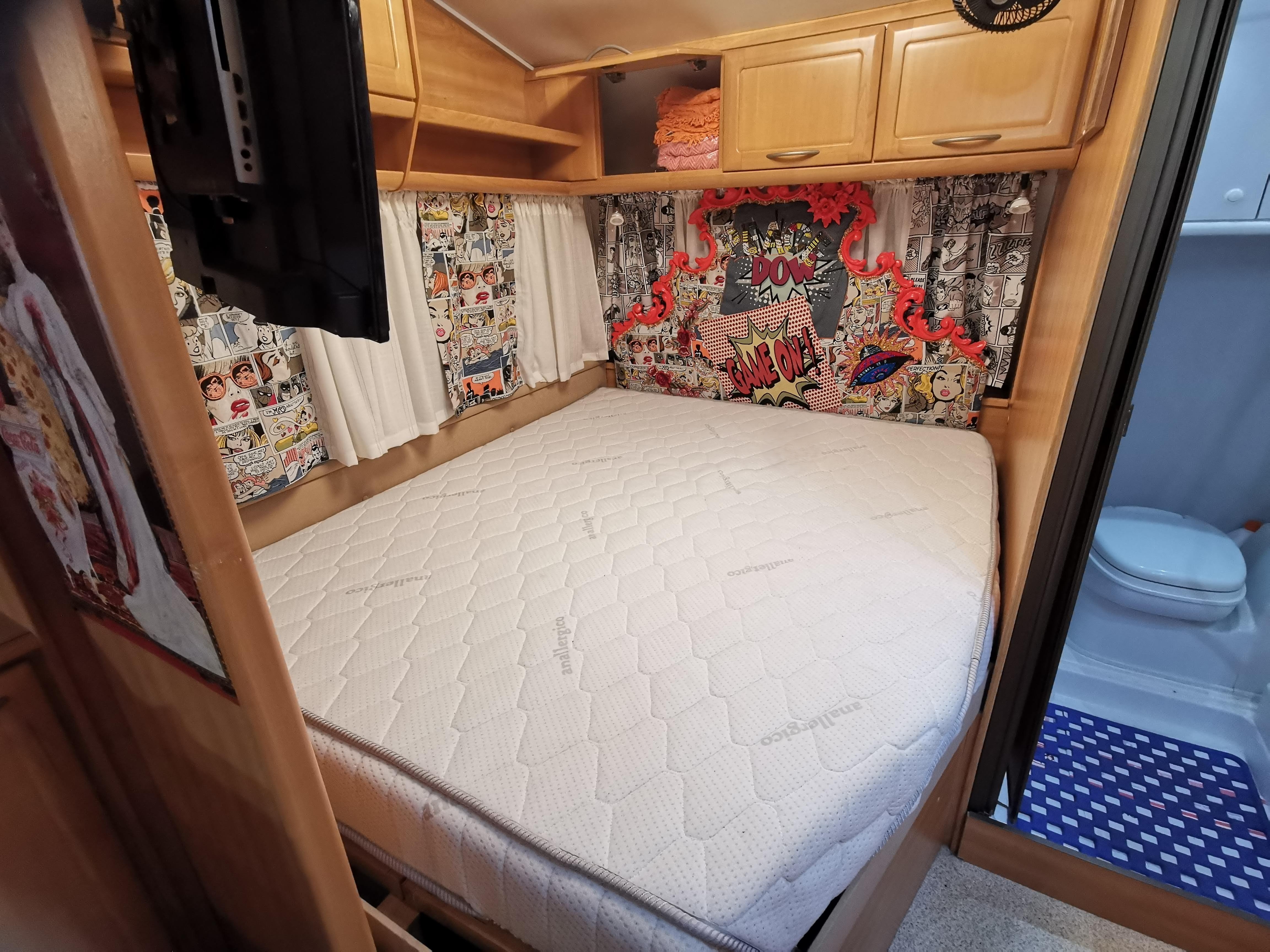 Nella zona notte troviamo un letto nautico matrimoniale contenitore, con materasso in memory, a livello ossia già pronto, senza doversi arrampicare su scalette per raggiungerlo, con testata letto in vero stile francese e fatta a mano da un professionista esperto. Il bagno con doccia, sempre nella zona anteriore, è chimico e la cassetta è esterna, quindi di facile utilizzo. La tenda per la doccia è originale della Knaus ed è la “costosissima tenda gonfiabile”.