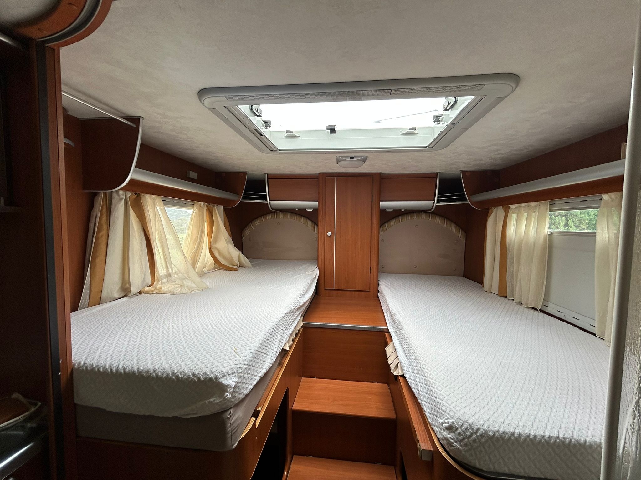 Separazione zona notte / giorno per mezzo di una vera porta di serie, bagno e doccia separati. Letti posteriori gemelli con possibilità di creare letto unico a 3 piazze.