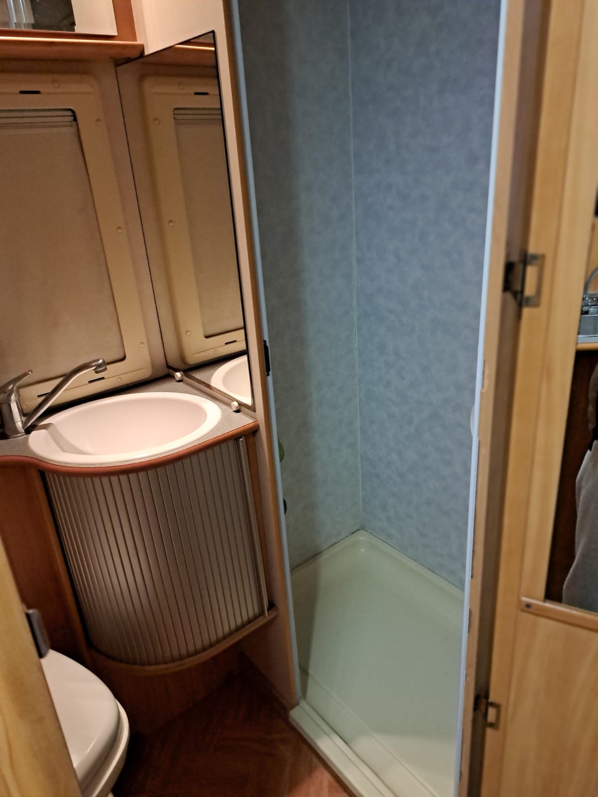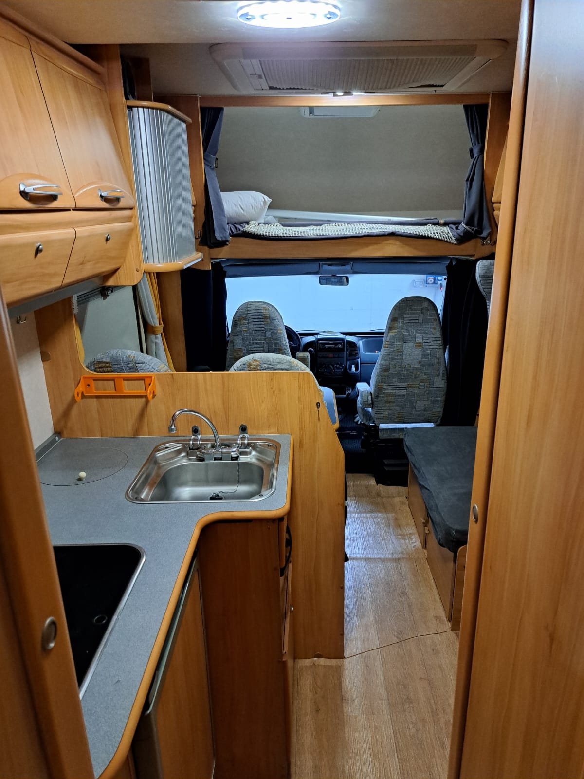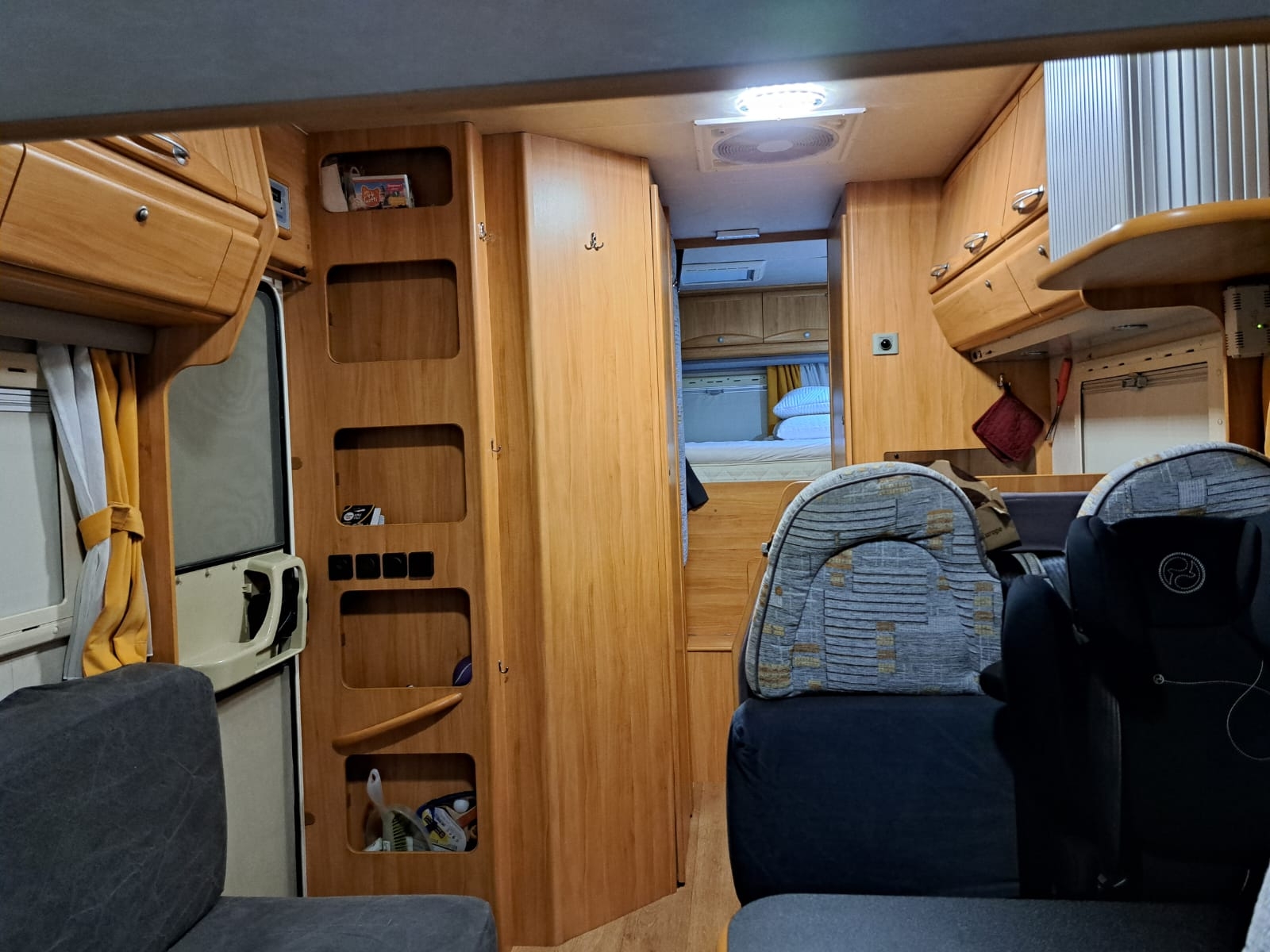 Semidinette con sedili girevoli, tavolo traslabile, divanetto laterale trasformabile in letto; ampia cucina angolare con piano di lavoro. Letto matrimoniale trasversale in coda e letto matrimoniale in mansarda con riscaldamento perimetrale. Bagno con cabina doccia separata, spazioso armadio e vari ripostigli. Illuminazione interna led. Ottime condizioni, sempre rimessato al coperto. Pneumatici 4 stagioni 2022, batteria motore 2026, batteria servizi 2023, distribuzione 2025, nessun lavoro da fare.