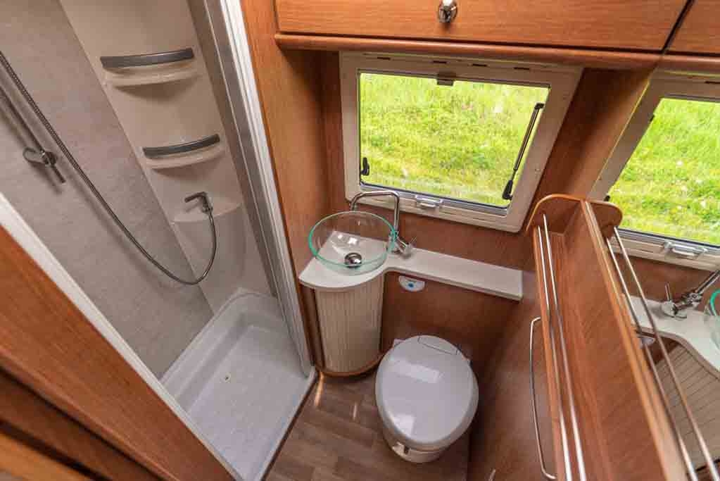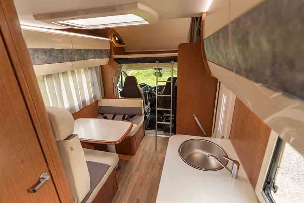 Appena si entra, si viene accolti da un’ampia dinette luminosa e confortevole, affiancata da una cucina lineare completa di tutto: due fuochi a gas, numerosi scomparti di stivaggio e un frigorifero trivalente da 167 litri con freezer separato da 29 litri, ideale per le vacanze più lunghe.