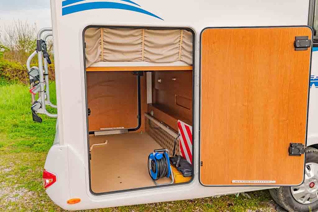 Sotto al letto posteriore si trova un ampio garage con doppio portellone, perfetto per riporre tutto l’occorrente per le vostre vacanze.