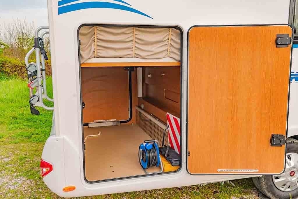 Al di sotto del letto matrimoniale trasversale posteriore vi è un ampio garage con doppio portellone.