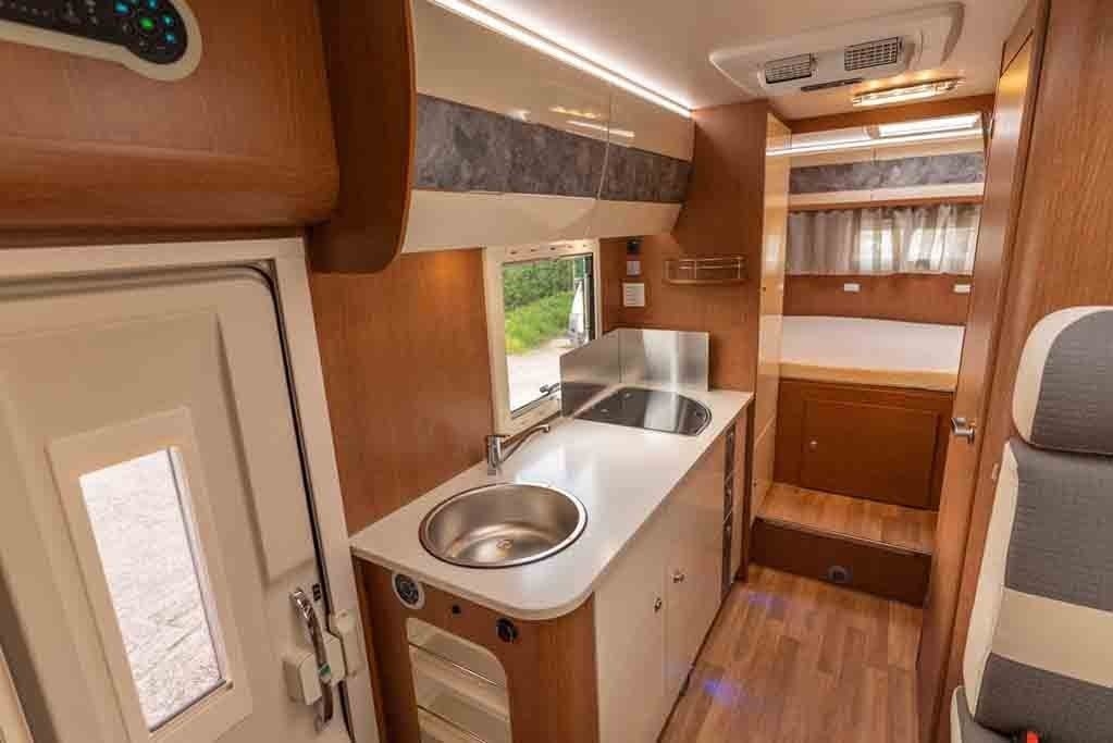 Ad accogliervi appena entrate vi è un'ampia dinette con cucina lineare, tantissimi scomparti per lo stivaggio e frigorifero trivalente da 167Lt 29Lt.