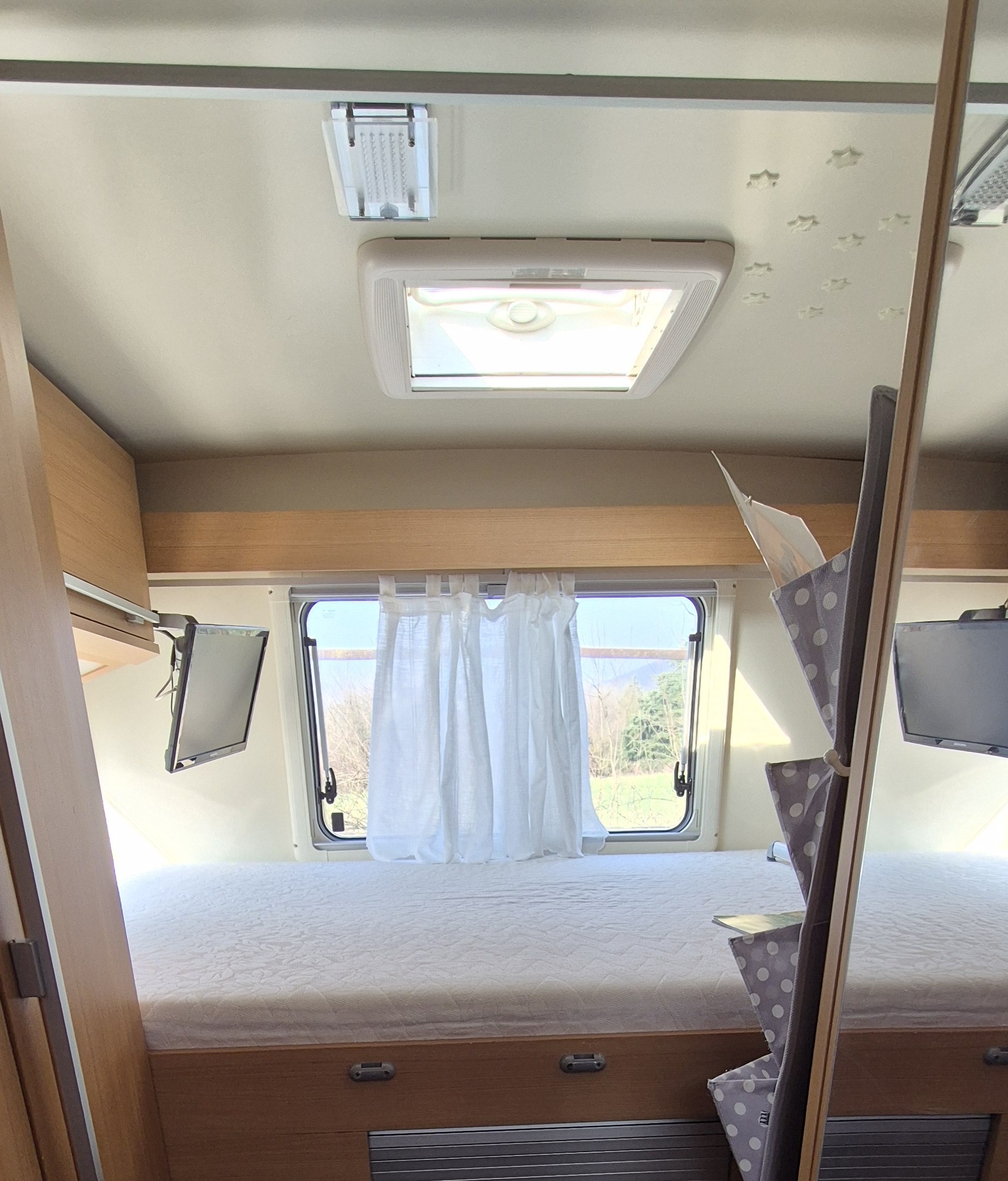 PORTA D’INGRESSO CON ZANZARIERA; DINETTE CON PANCHE CONTENITORE TRASFORMABILE IN LETTO MATRIMONIALE; FINESTRE E OBLO’ CON OSCURANTI E ZANZARIERE PLISSETTATE, MAXIOBLO’ SOPRA IL TAVOLO; CUCINA LATERALE CON CAPPA ASPIRANTE, CUCINA 4 FUOCHI, SCALDAVIVANDE, FORNO A GAS E FRIGO TRIVALENTE 150 LITRI CON CONGELATORE SEPARATO; 2 ARMADI E VARI PUNTI DI STIVAGGIO; LETTO MATRIMONIALE TRASVERSALE IN CODA, LETTO MATRIMONIALE IN MANSARDA; TV; BAGNO CON LAVABO FISSO E AMPIA DOCCIA SEPARATA; DOPPIO PAVIMENTO CON GAVONI RIPOSTIGLIO; MAXI GARAGE CON POSSIBILITA’ D’ACCESSO DALL’INTERNO E GRANDI PORTE DI ACCESSO SIA A DESTRA CHE A SINISTRA; DOPPIO SERBATOIO ACQUE 100LT; ATTACCHI ESTERNI GAS E DOCCIA; DOPPIA LUCE ESTERNA E DOPPIO ATTACCO 220W.