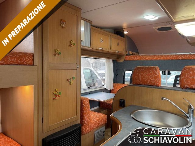 Portamoto con relativo foglio di omologazione a 150 kg, Climatizzatore cellula a tetto, Veranda, Pannello solare, Retrocamera con display a specchietto, Doppio serbatoio acque chiare, Oblò con turbovent, Porta pacchi con scaletta posteriore, Luce esterna, Impianto radio con radio CD+USB, Vetri elettrici, Braccioli sedili cabina + VARIE CAMPER MANSARDATO IN VETRORESINA, IDEALE PER FAMIGLIE CON LETTI A CASTELLO E AMPIA ZONA GIORNO, 7 POSTI LETTO E VIAGGIO.