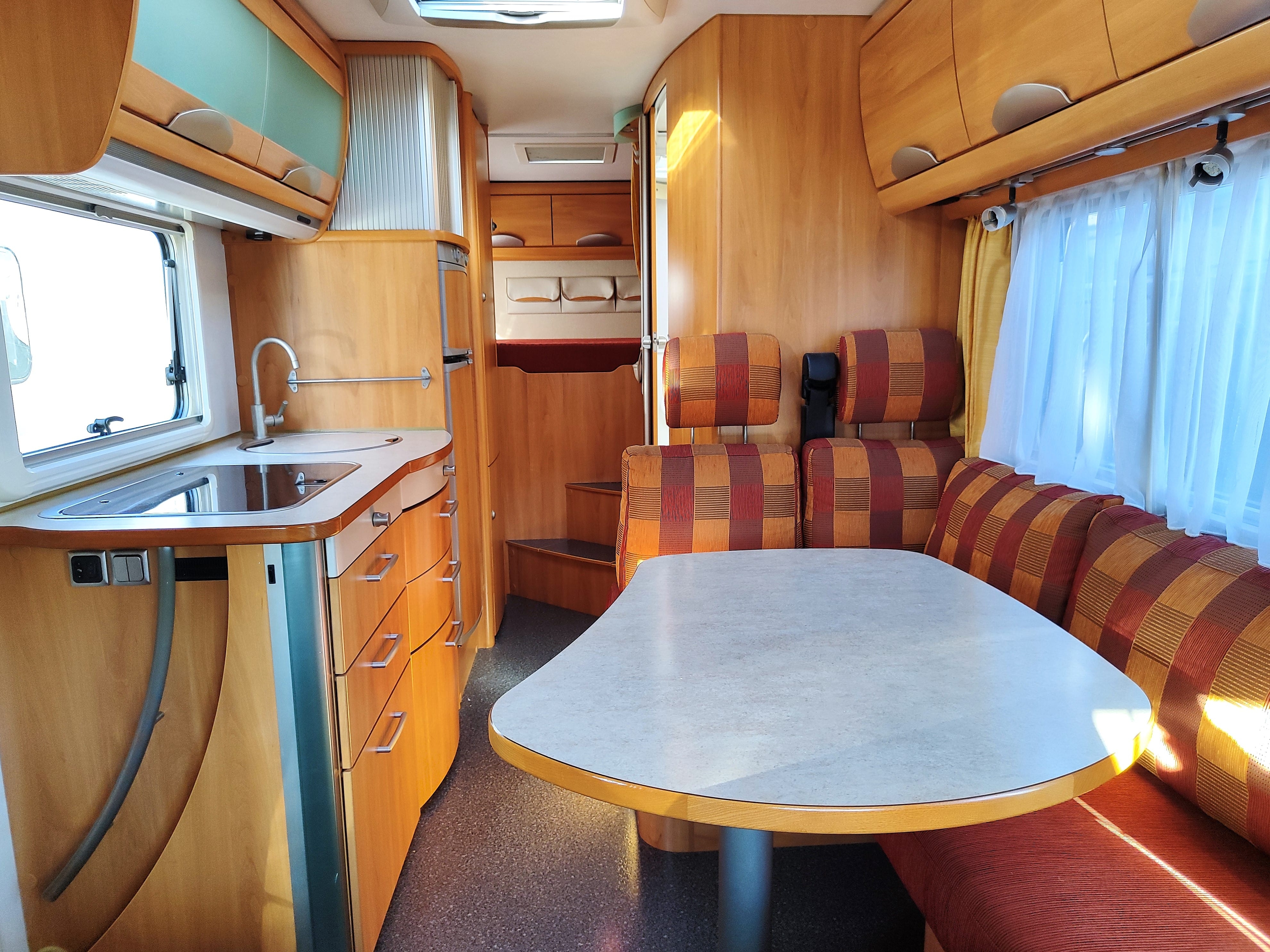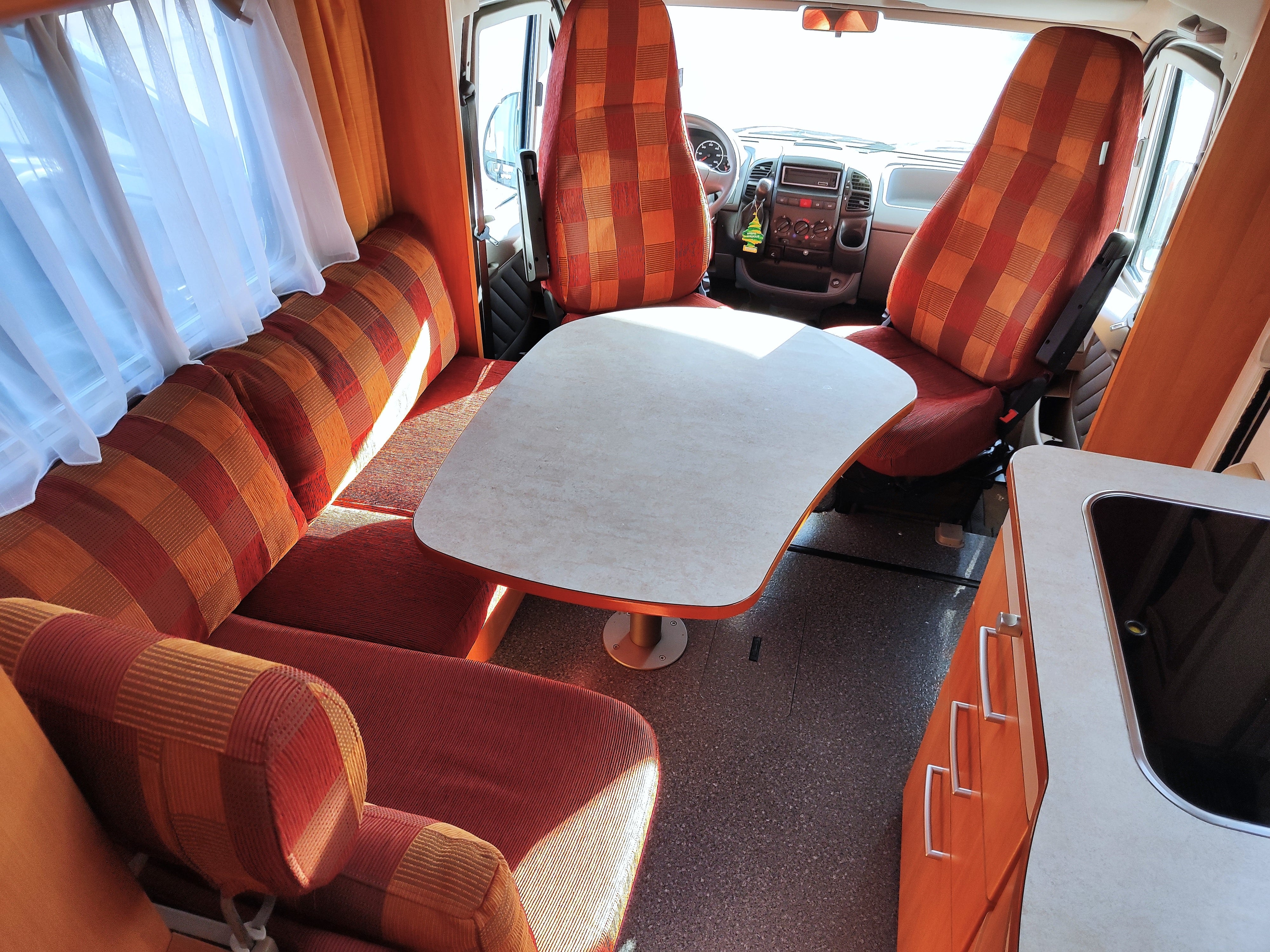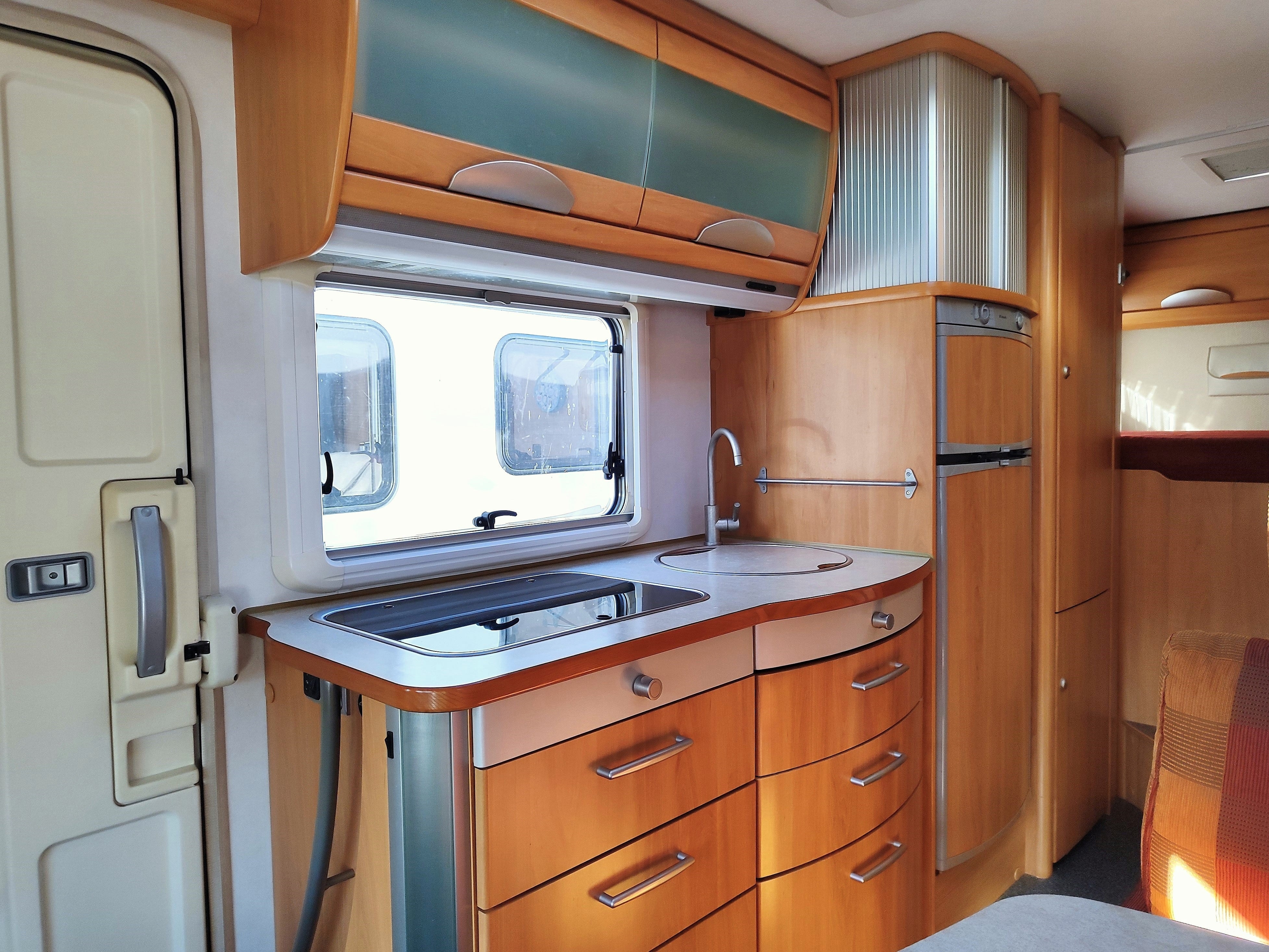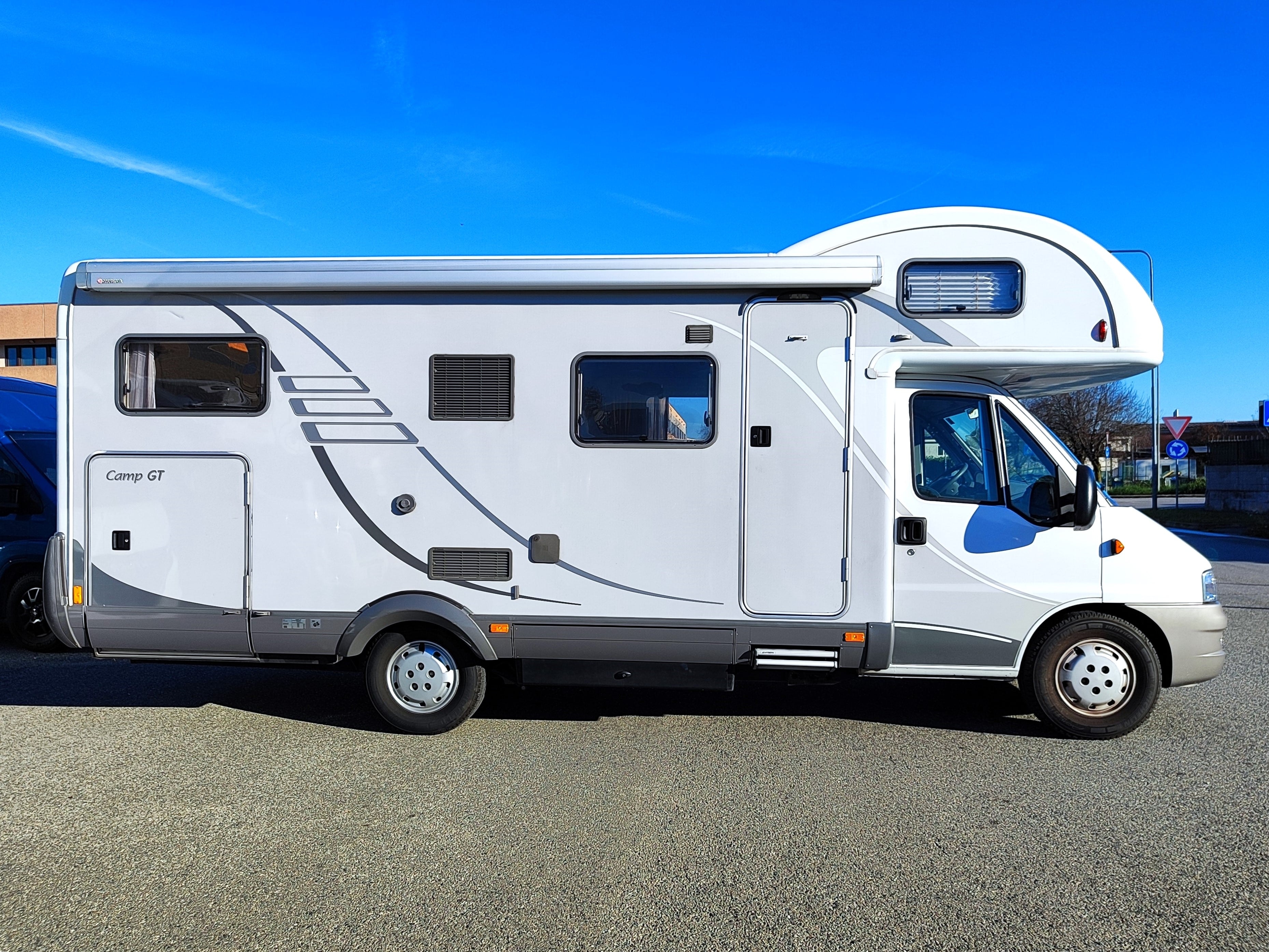 Camper usato con ampia zona giorno, dinette con divano a L, letto matrimoniale trasversale e letto in mansarda, bagno con doccia e garage. Su Fiat Ducato.
