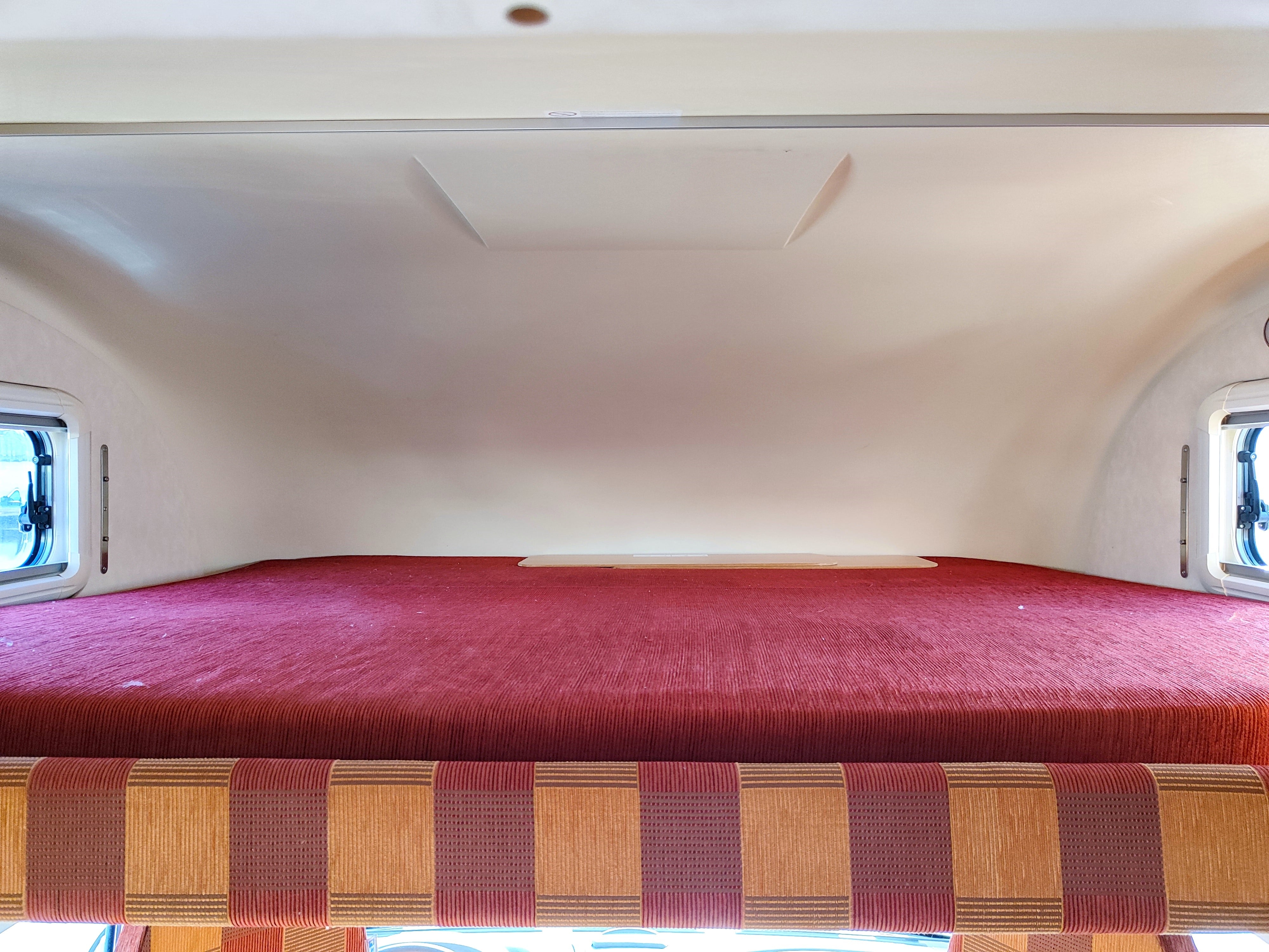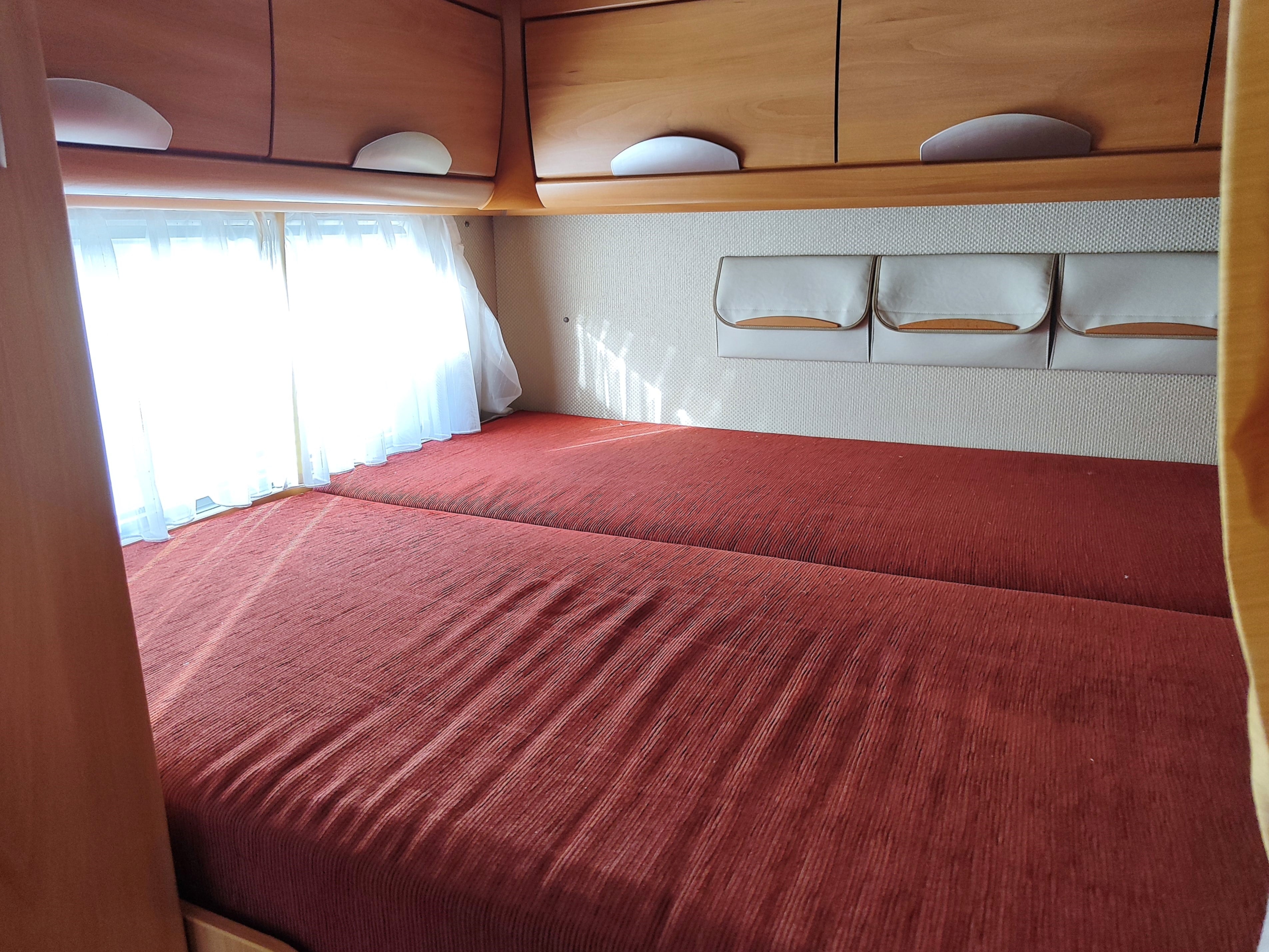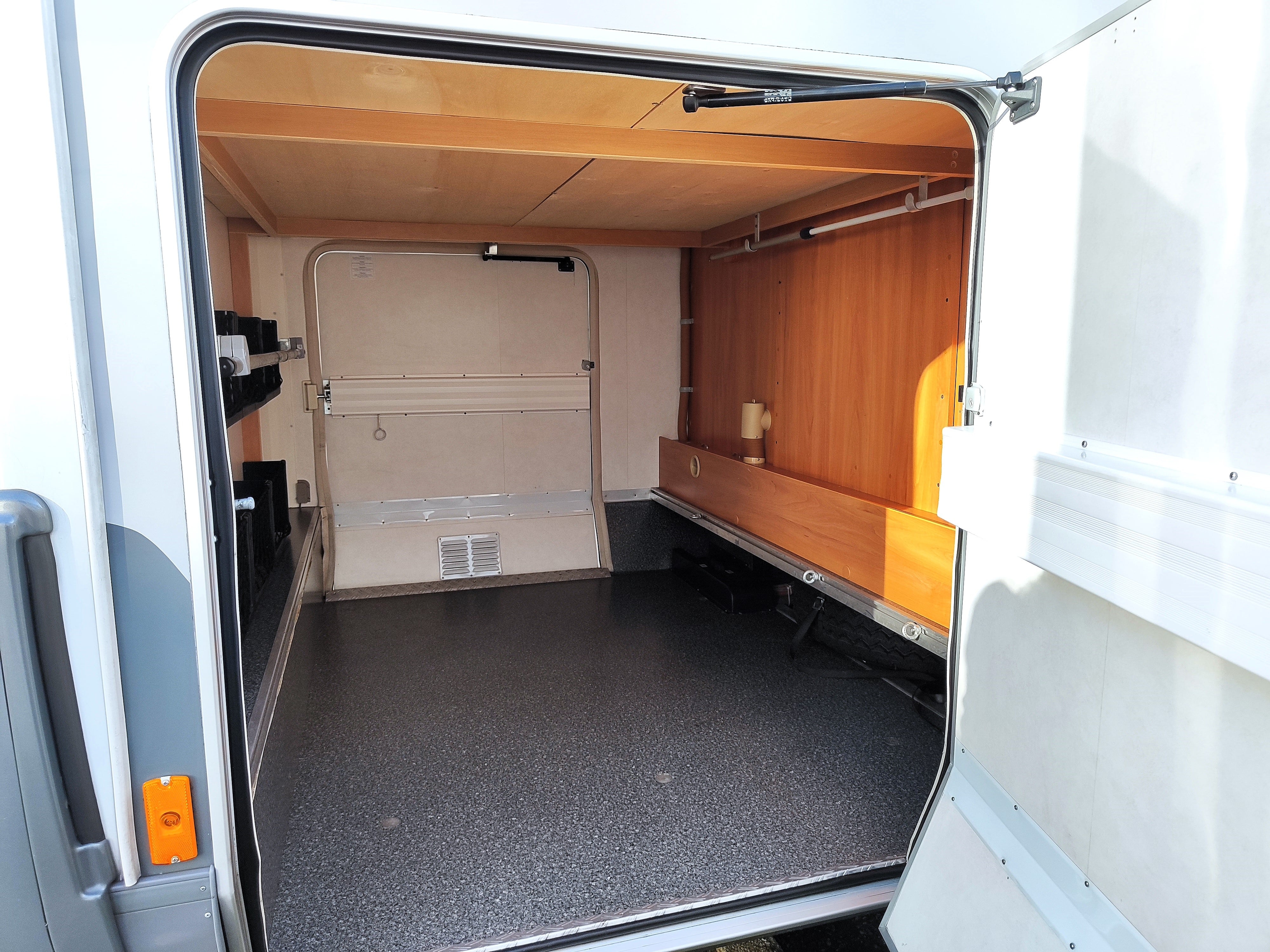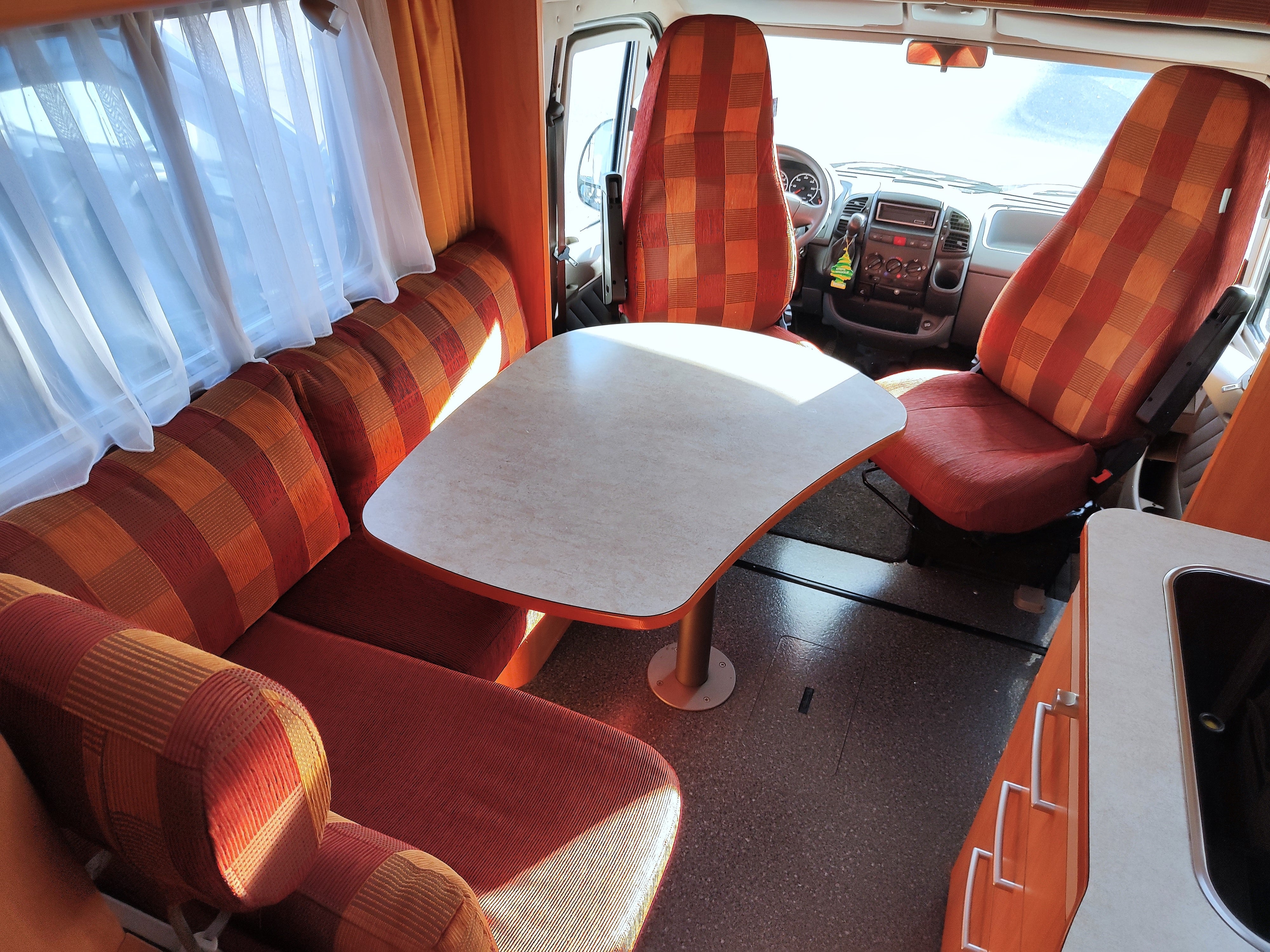 Camper usato con ampia zona giorno, dinette con divano a L, letto matrimoniale trasversale e letto in mansarda, bagno con doccia e garage. Su Fiat Ducato.