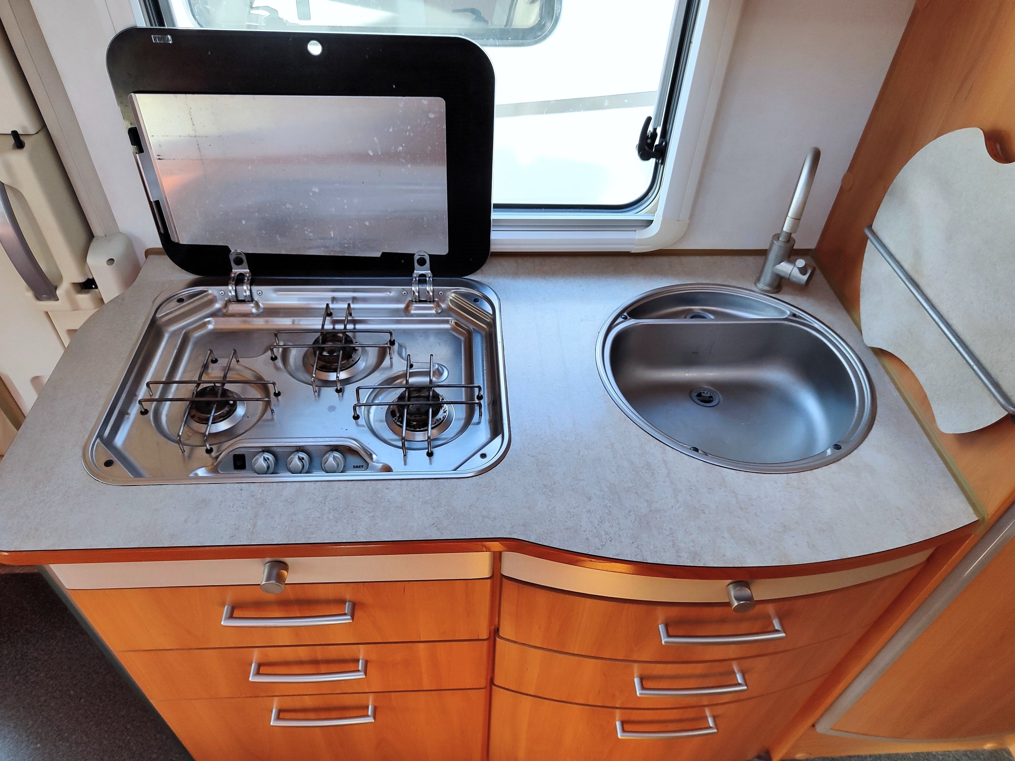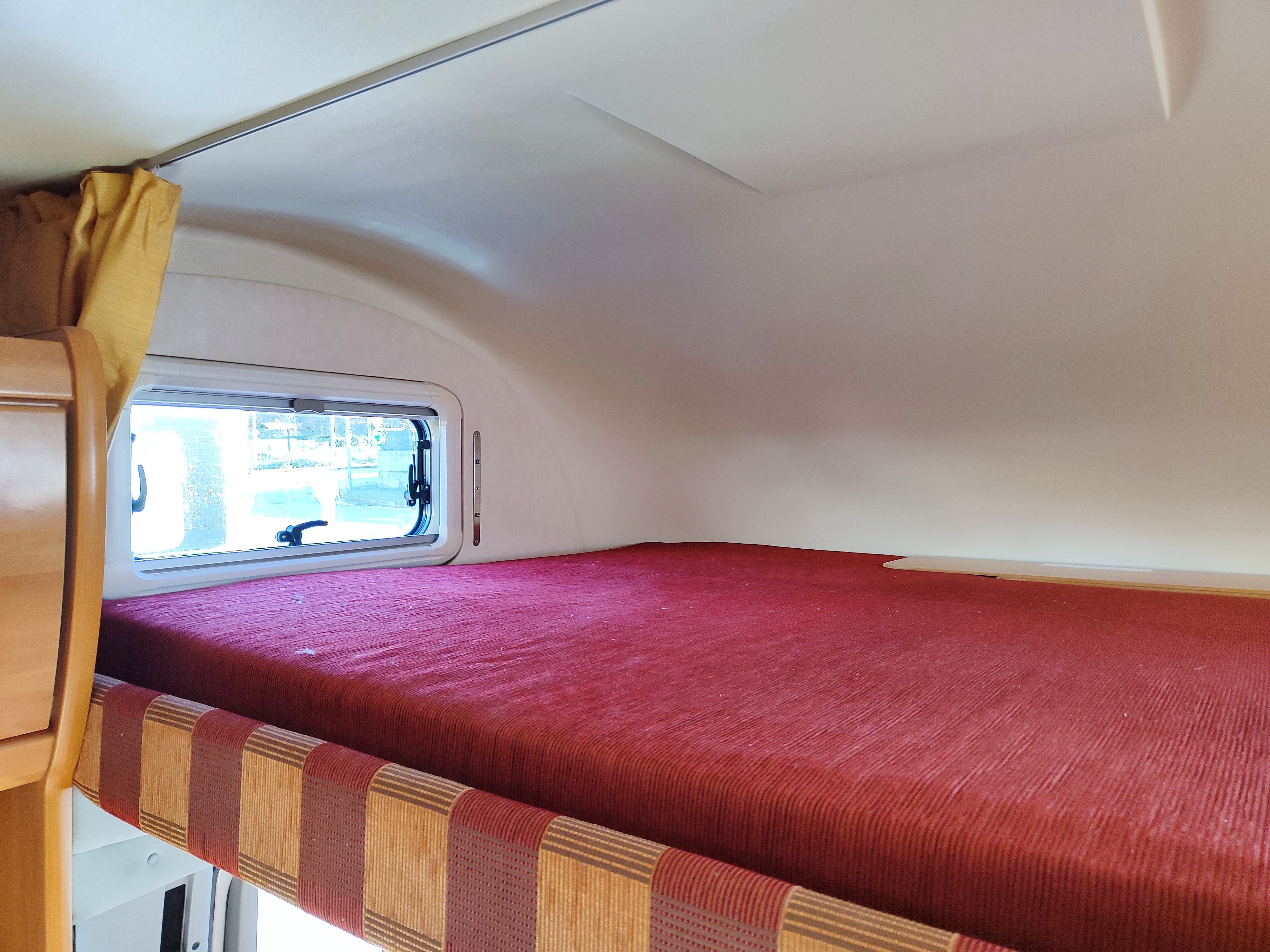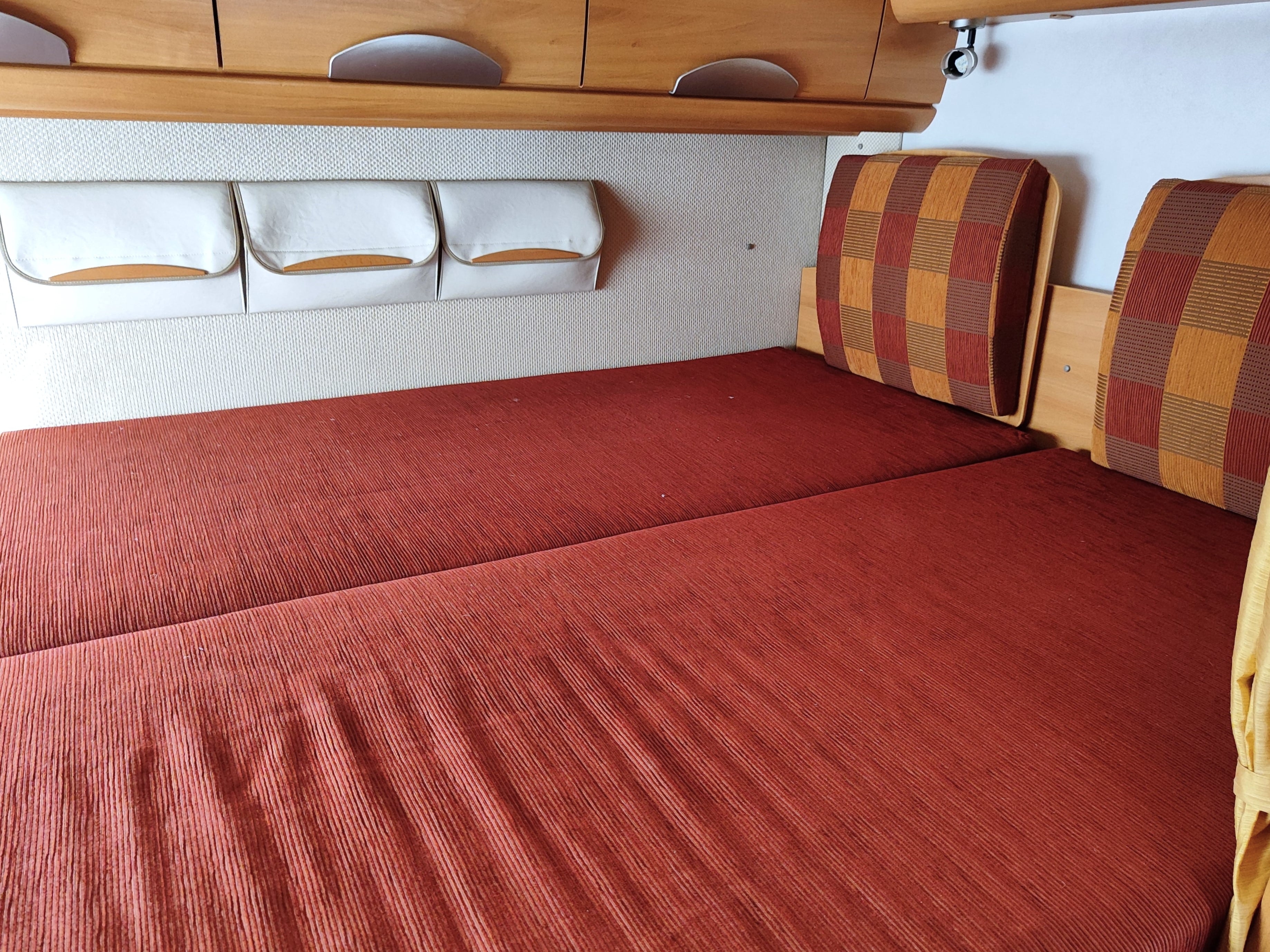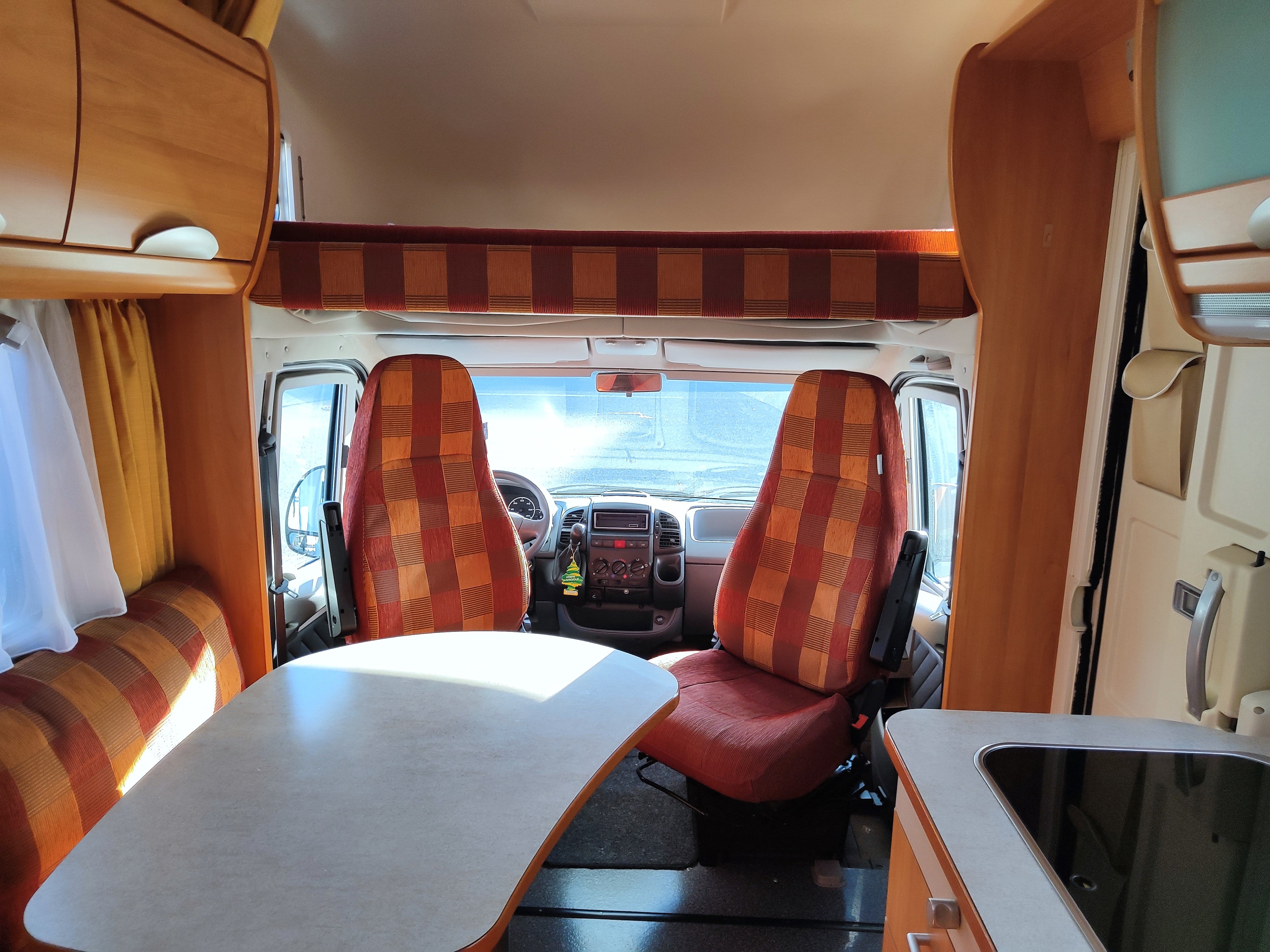 Camper usato con ampia zona giorno, dinette con divano a L, letto matrimoniale trasversale e letto in mansarda, bagno con doccia e garage. Su Fiat Ducato.