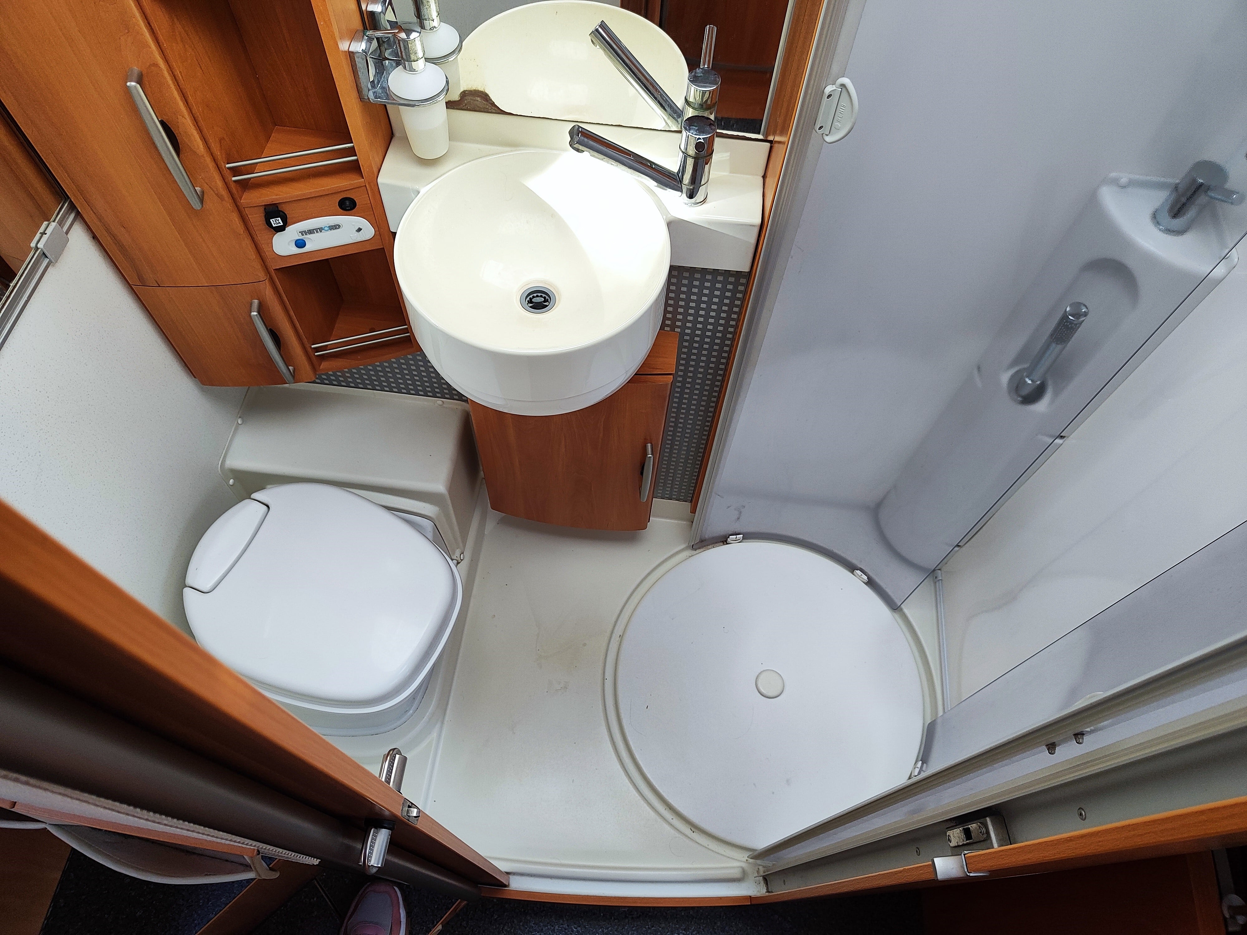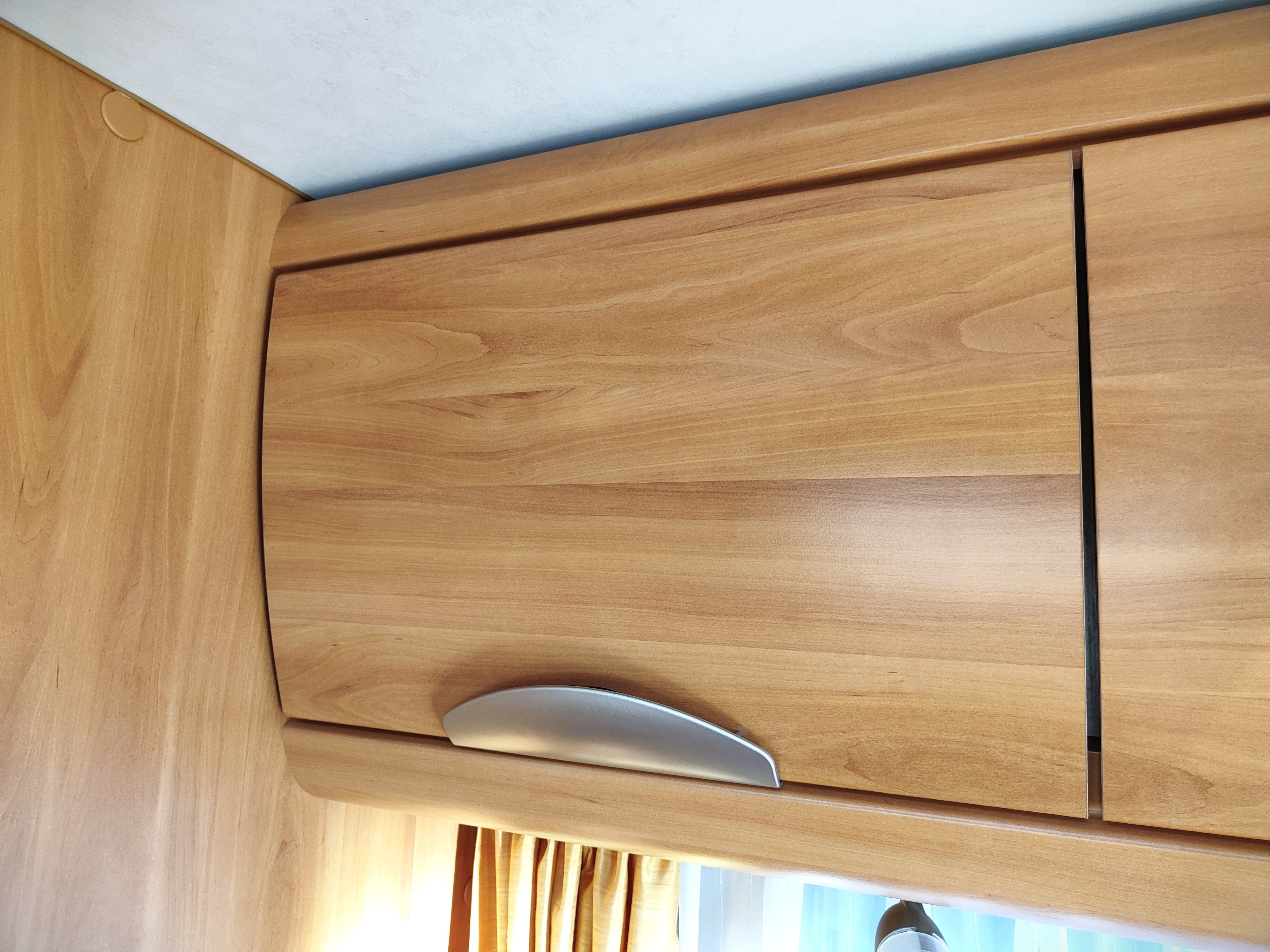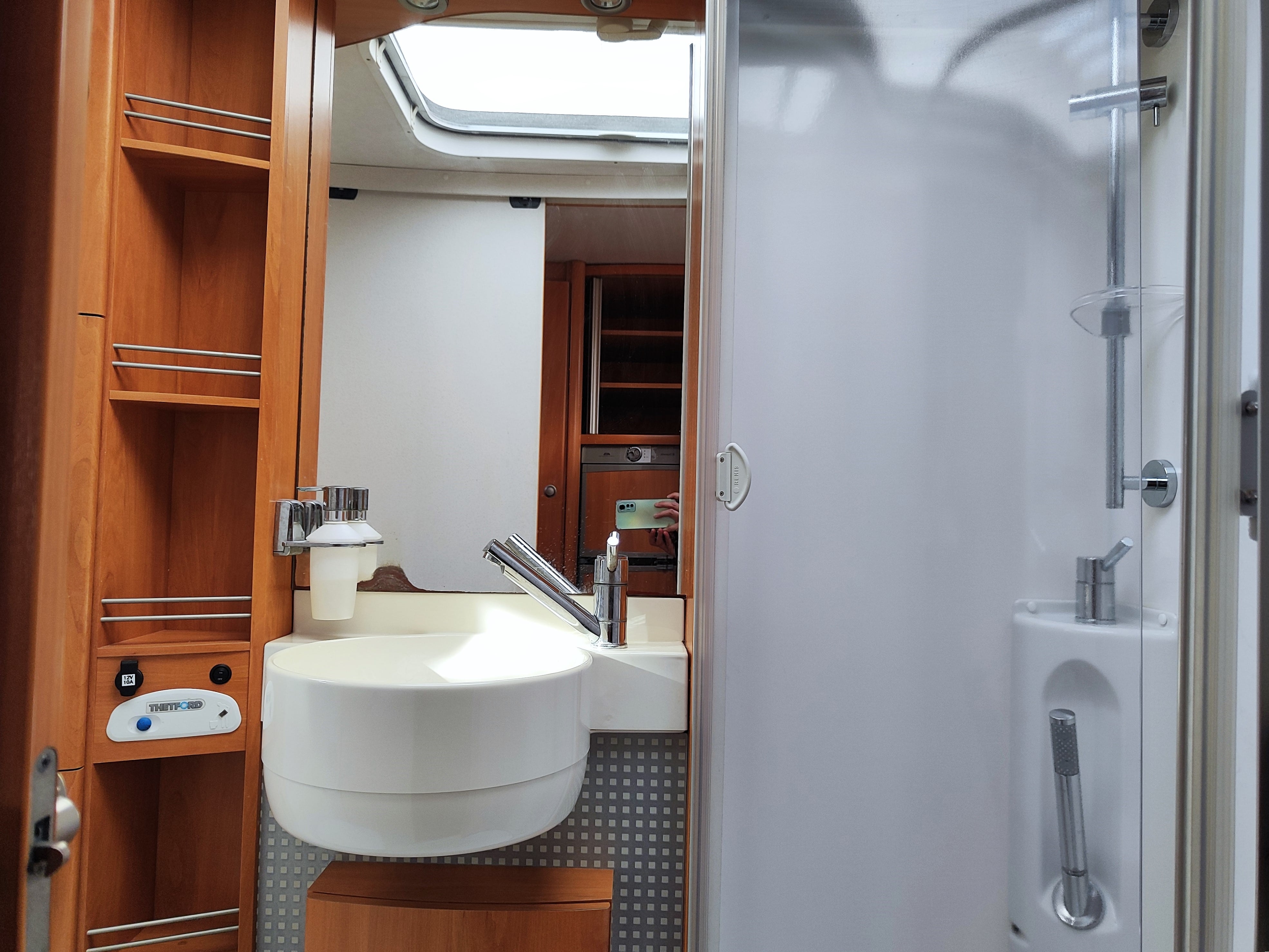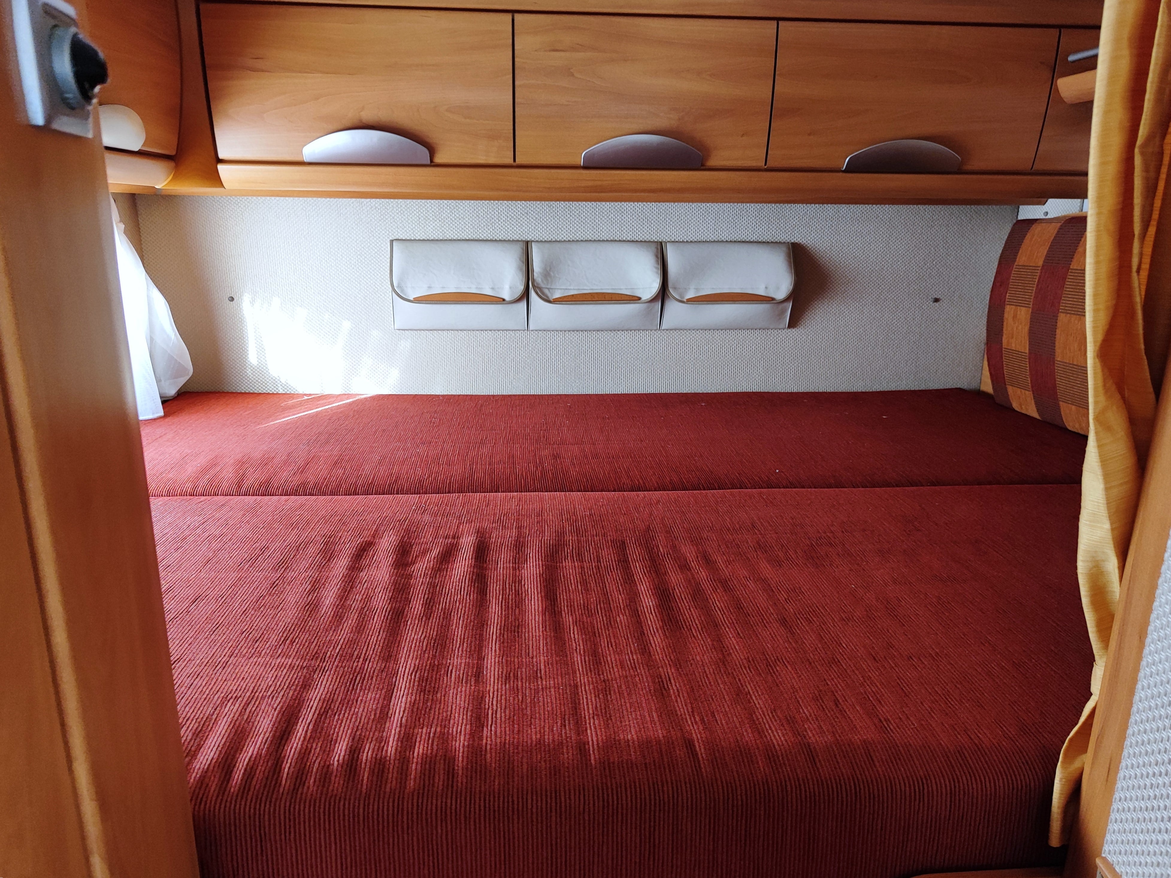Camper usato con ampia zona giorno, dinette con divano a L, letto matrimoniale trasversale e letto in mansarda, bagno con doccia e garage. Su Fiat Ducato.