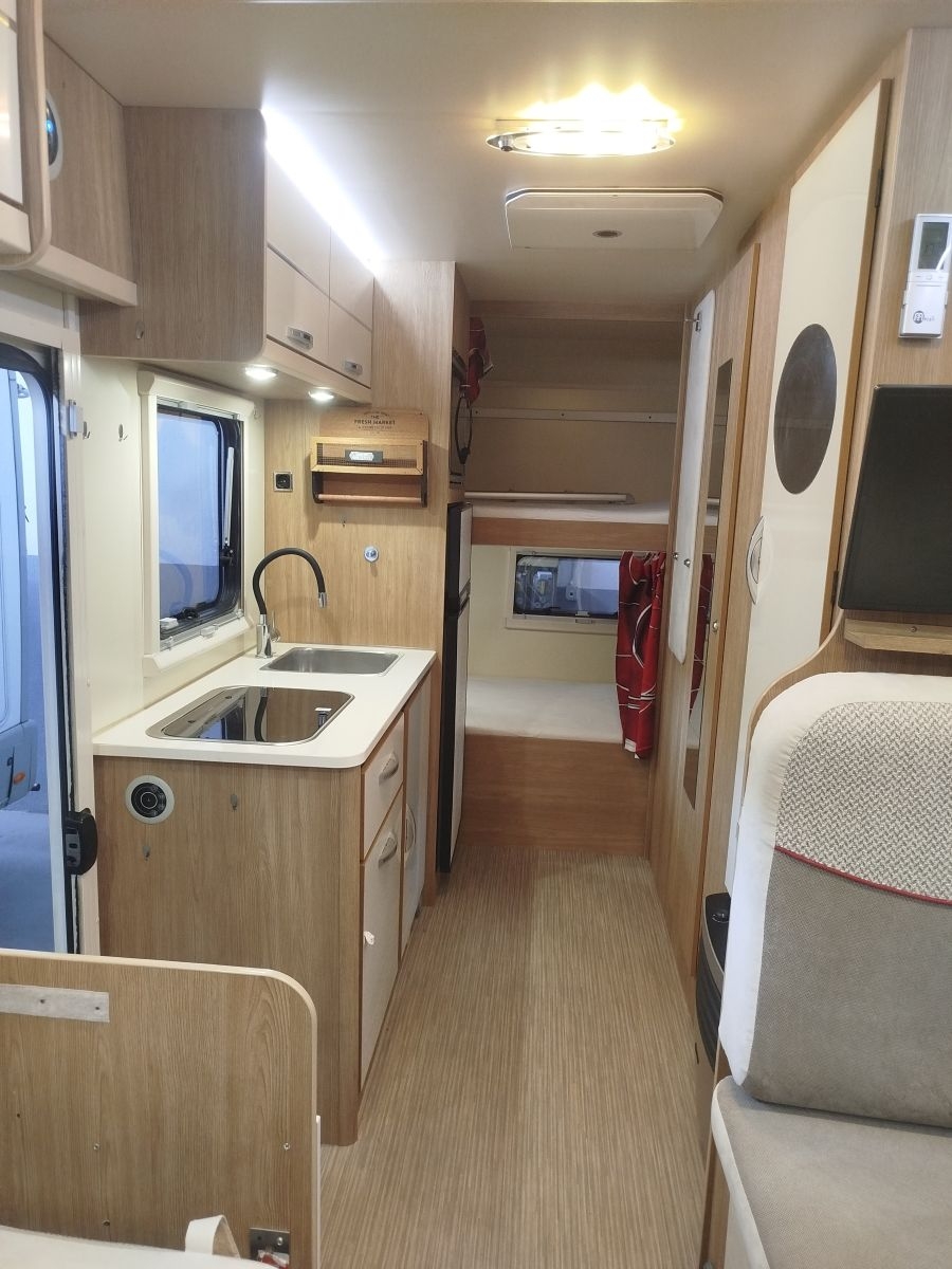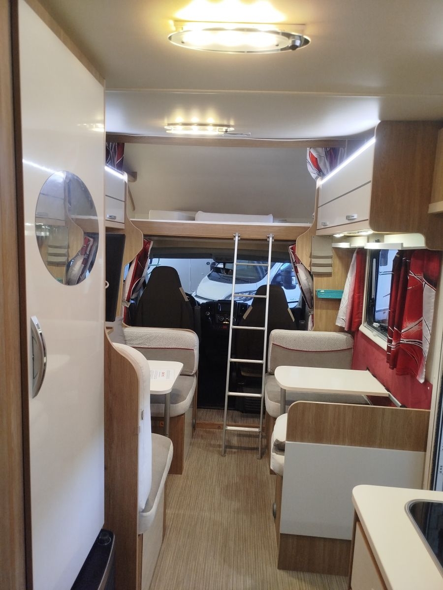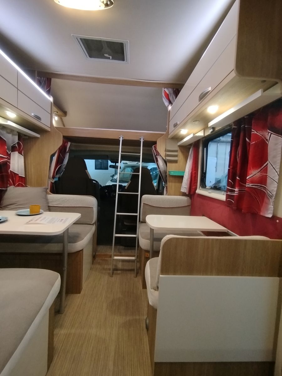 Veicolo ideale per la famiglia, con un’ottima abitabilità interna avendo una doppia dinette, quattro + due posti frontali, trasformabili in letto matrimoniale e lettino singolo, più ampi lettini a castello trasversali in coda e letto matrimoniale in mansarda. Bagno con integrato ampio box doccia, riscaldamento a gas stufa Truma + boiler per acqua calata, cucina a tre fuochi, forno a gas, frigo grande da 156 l.