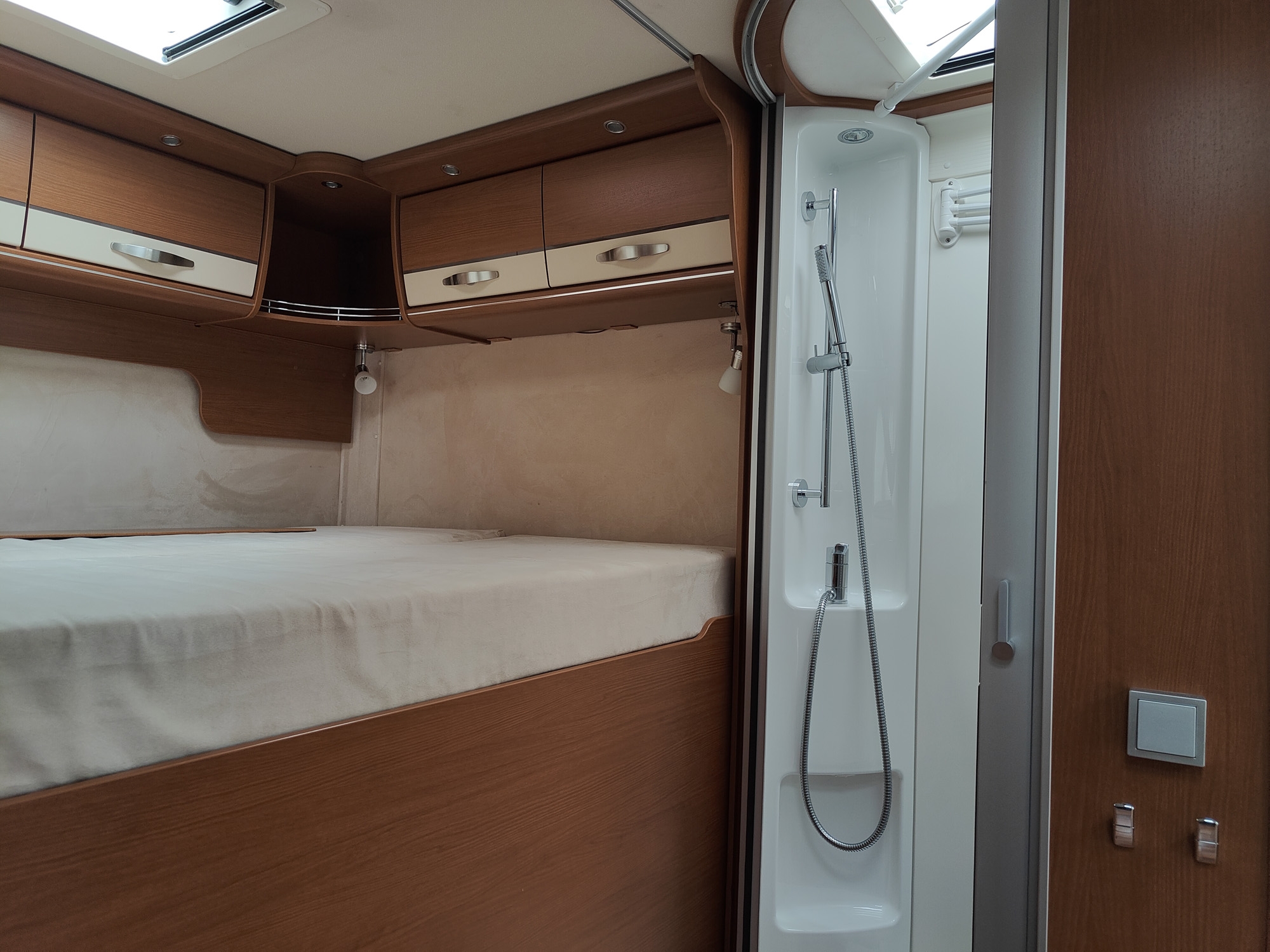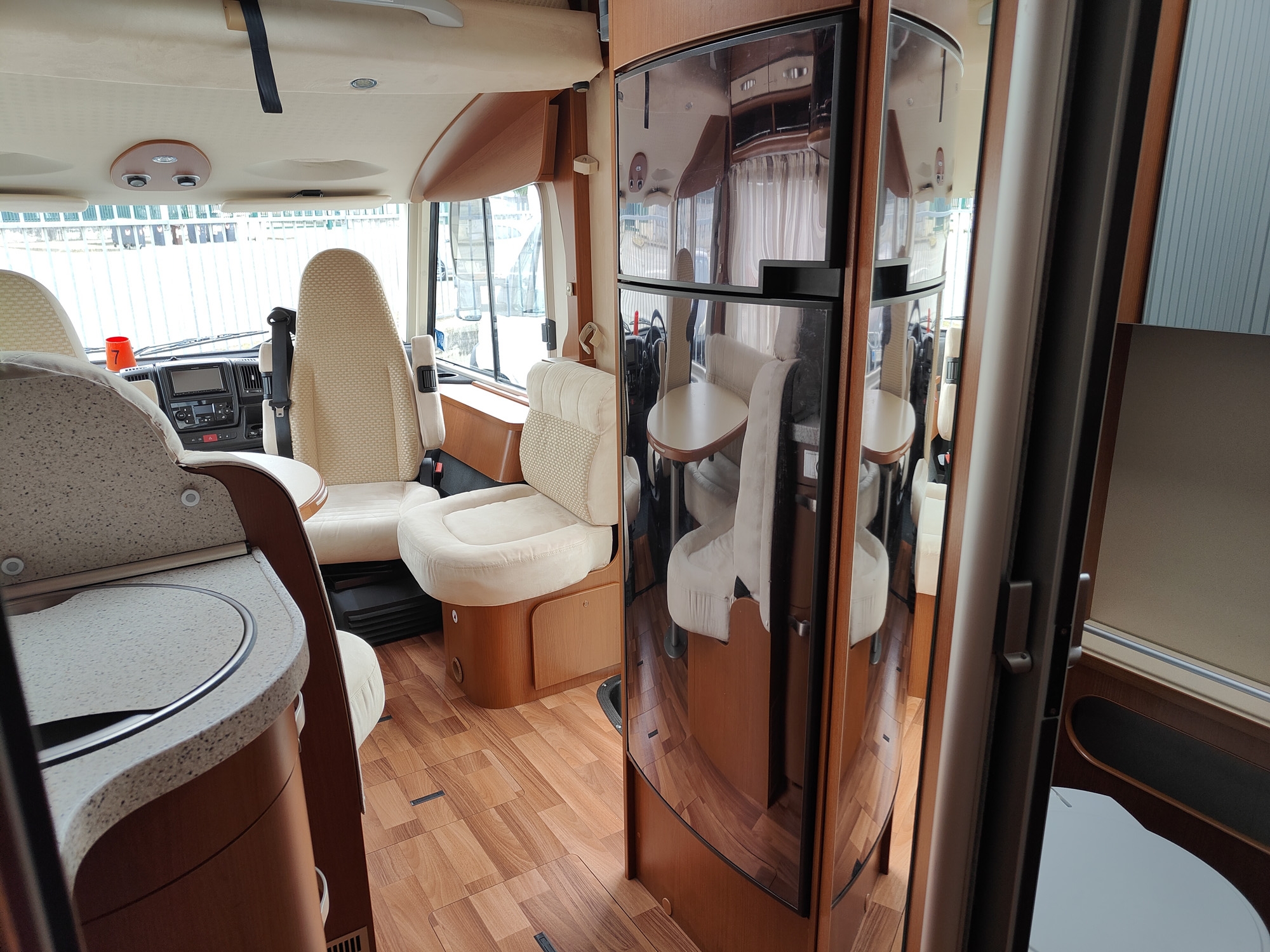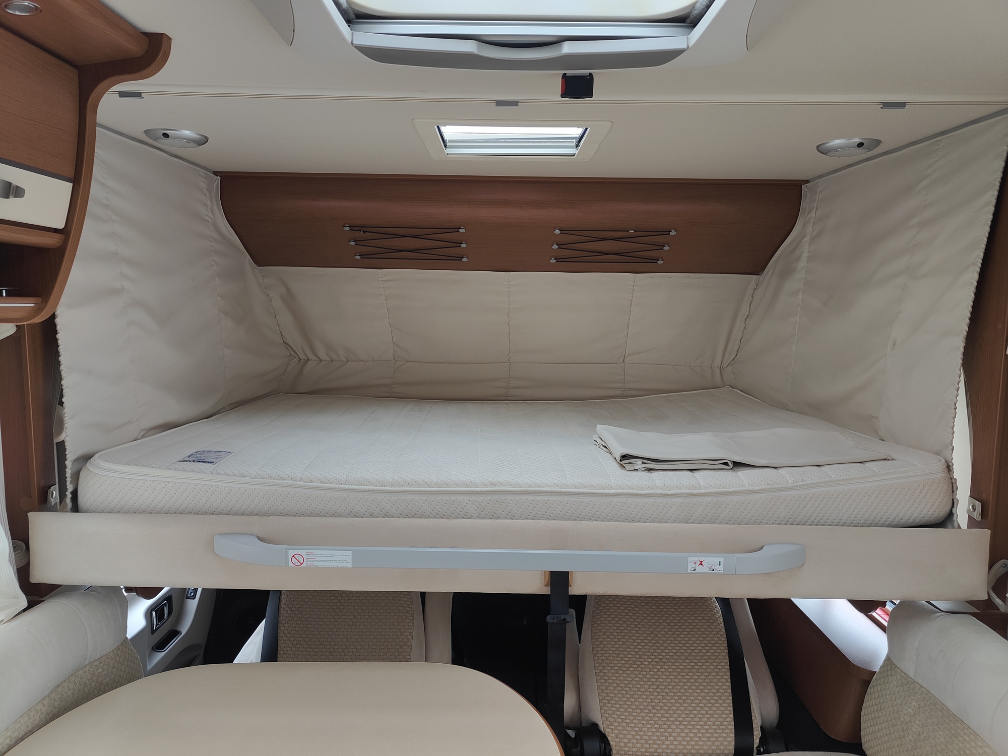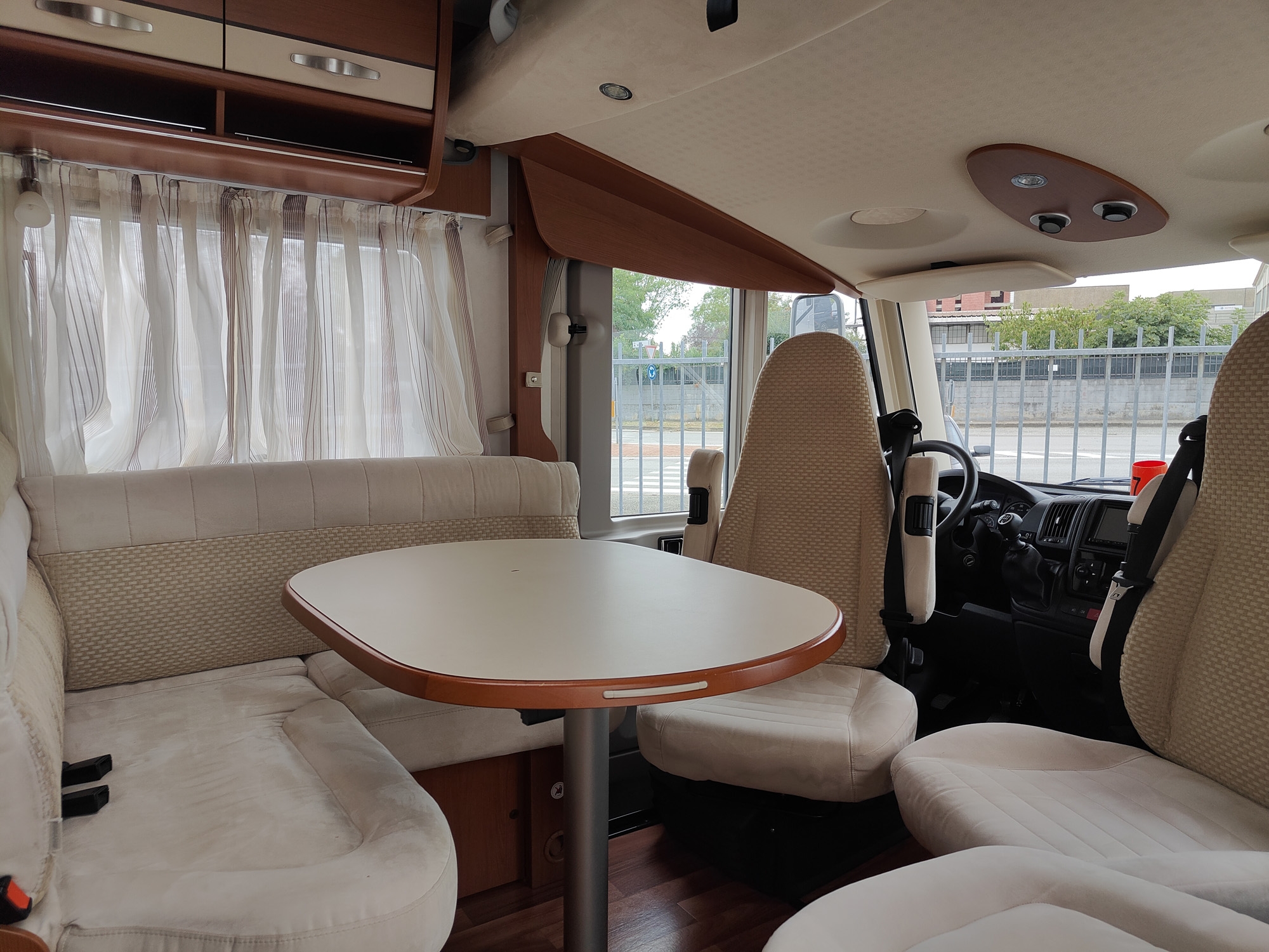 Camper motorhome usato con letto matrimoniale posteriore e basculante, grande zona giorno nella parte anteriore, cucina ad L e bagno con doccia separata.