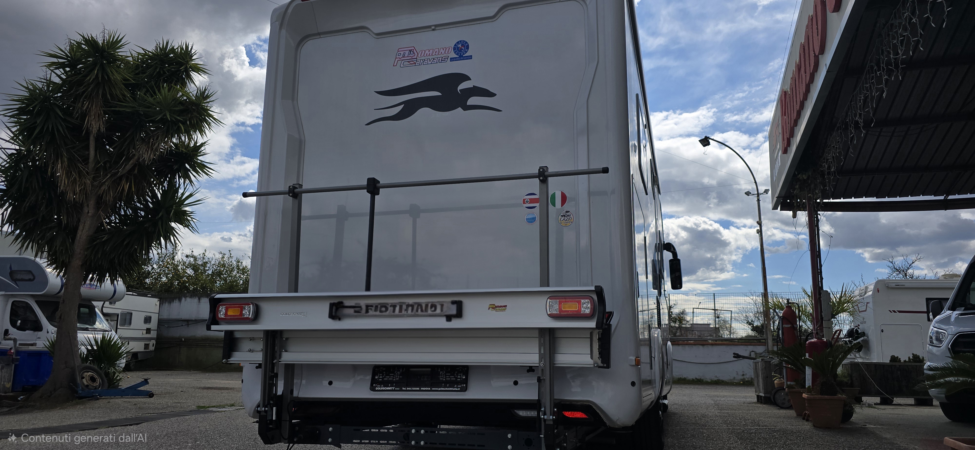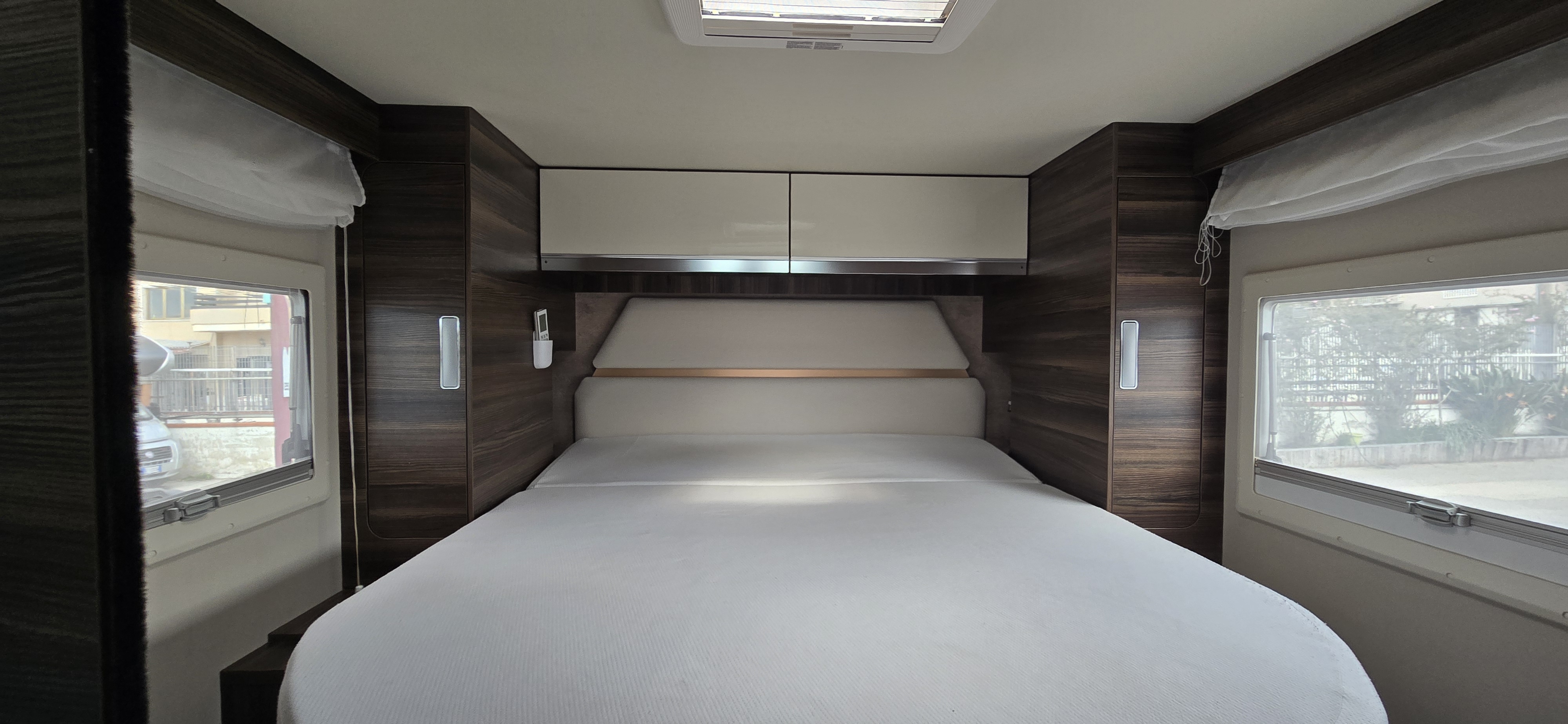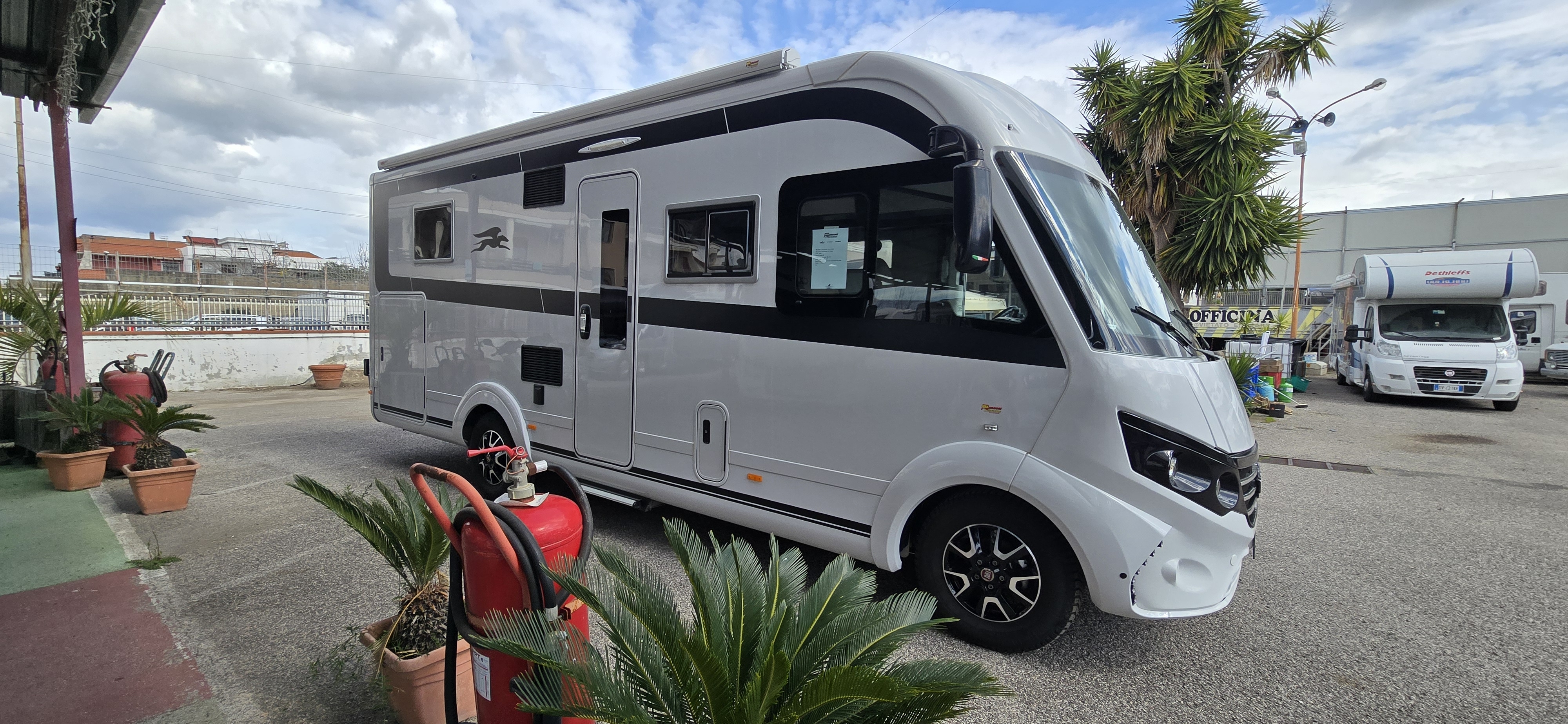 portamoto, piedini di stazionamento idraulici, aria condizionata, inverter, sensori di parcheggio anteriori e posteriori, retrocamera, zanzariera porta, plissettati anteriori, prese esterne acqua e gas,