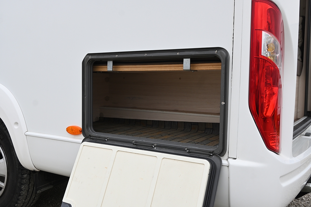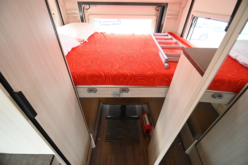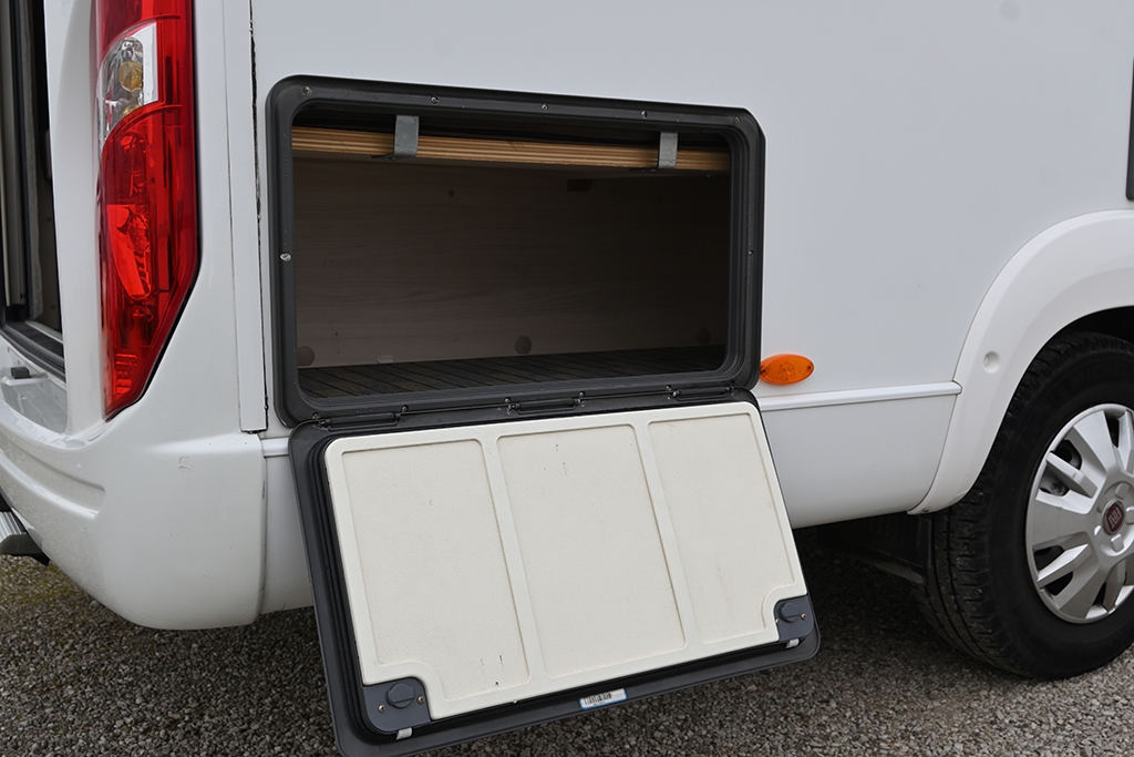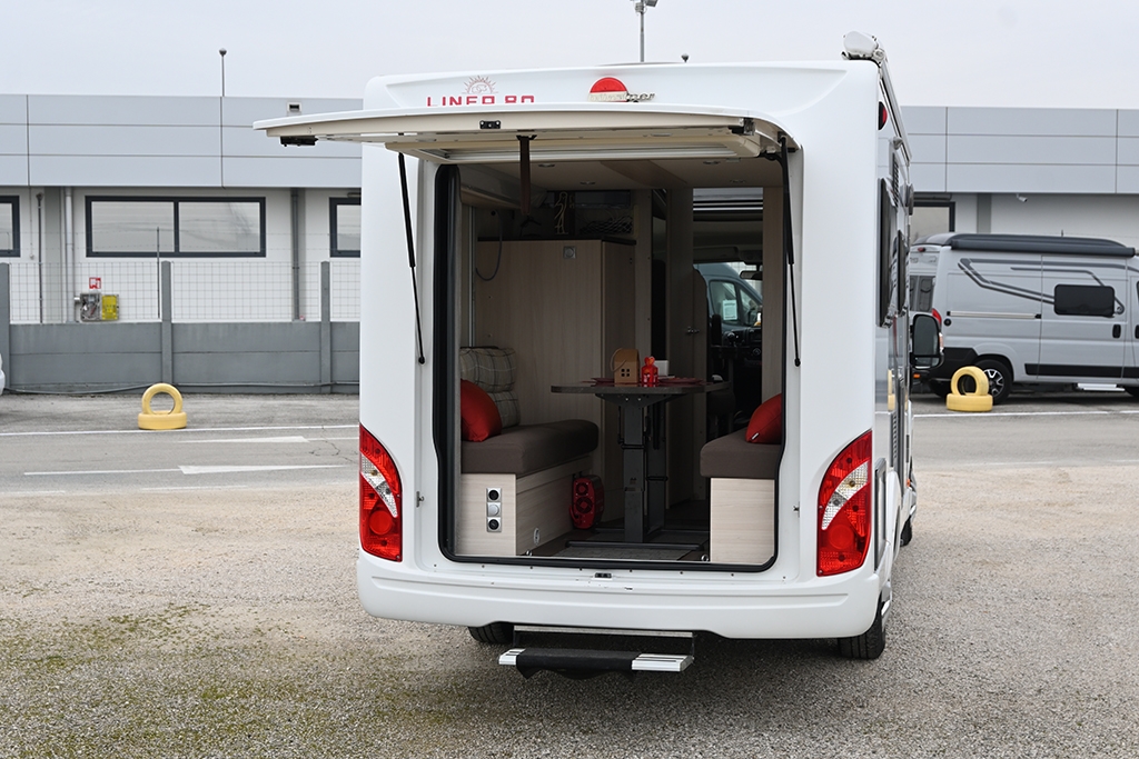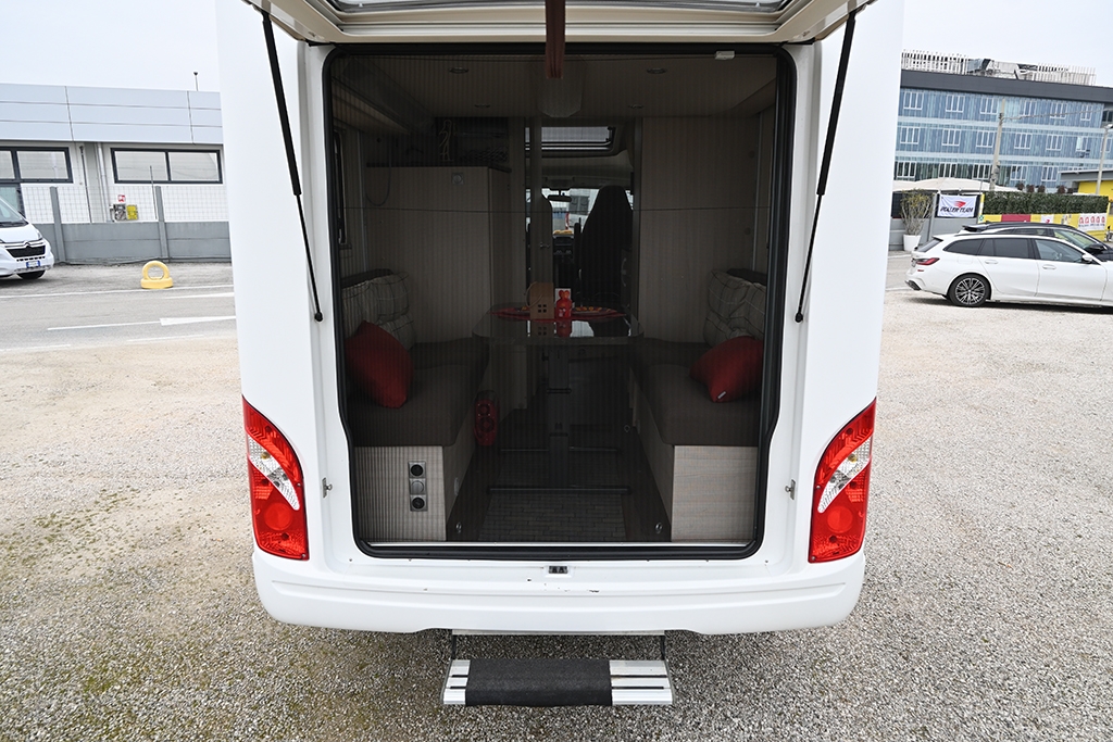 Semintegrale unico nel suo genere, dotato di letto matrimoniale basculante che discende elettricamente al di sopra dell’ampio living posteriore e di grande portellone inserito nella parete di coda! Unico proprietario!