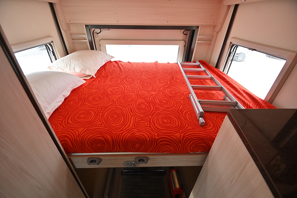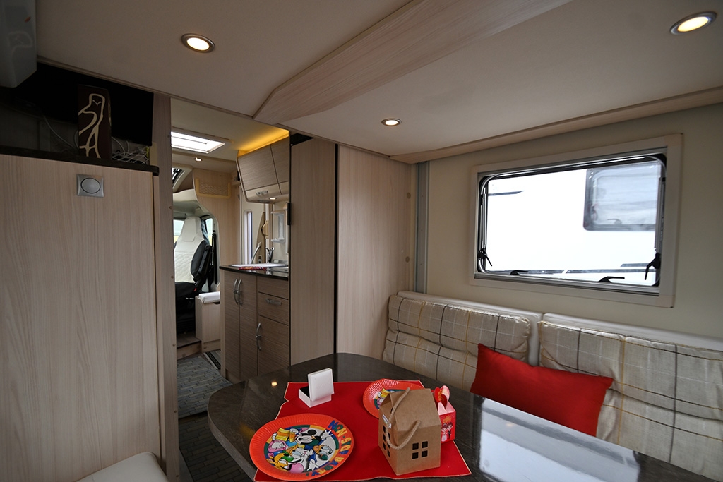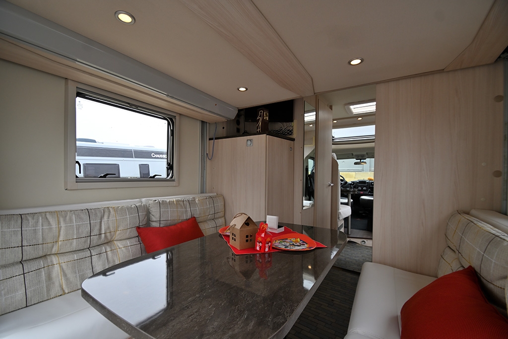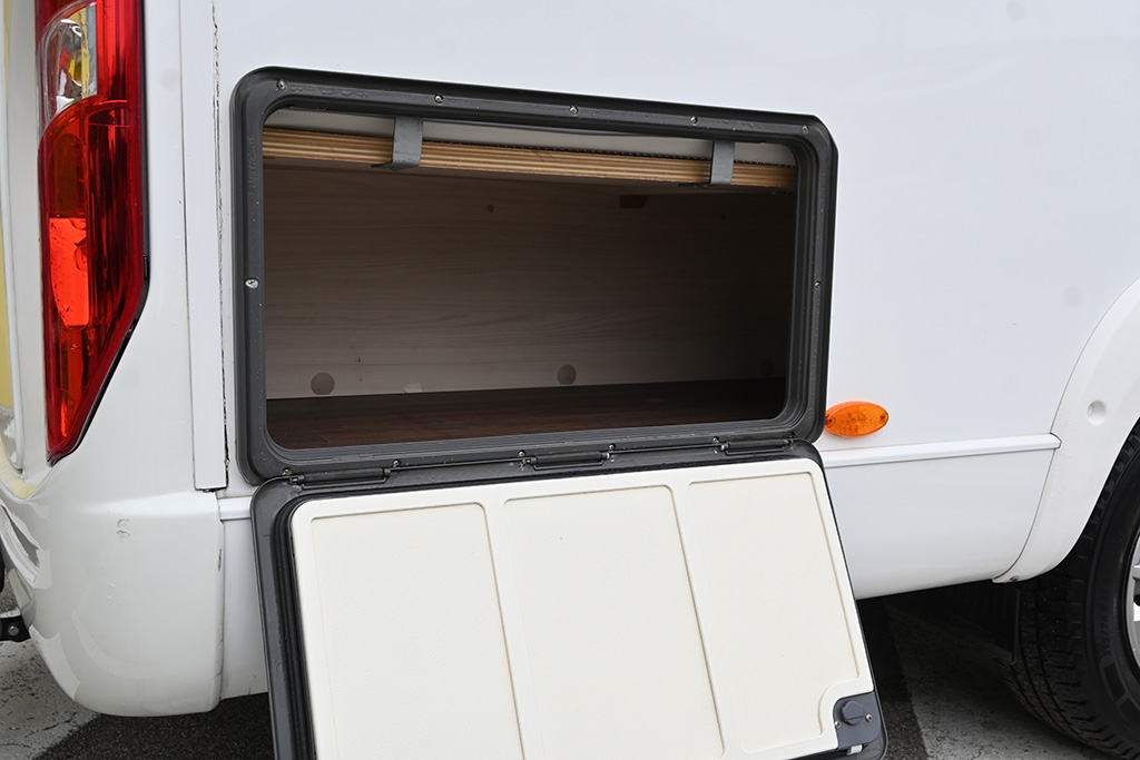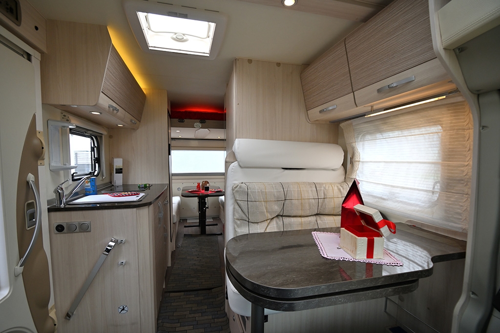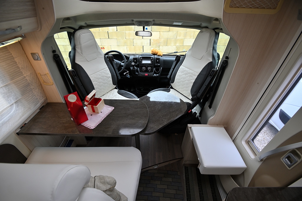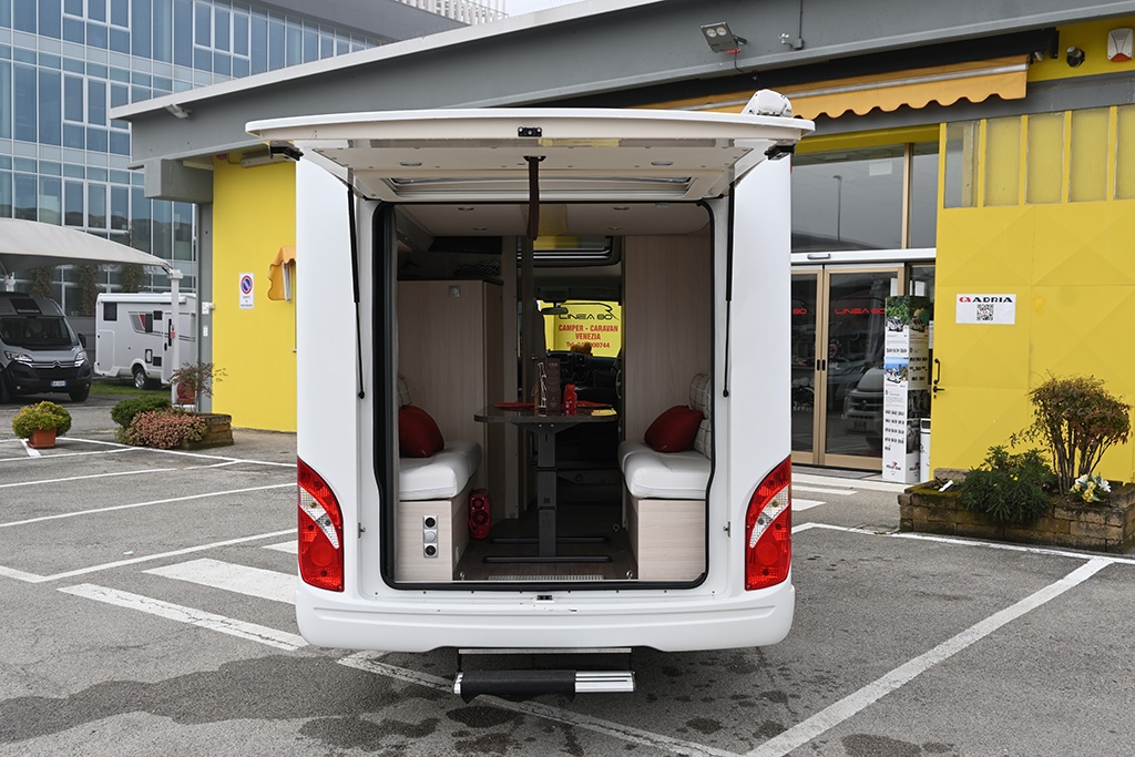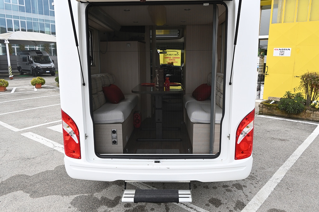 Semintegrale unico nel suo genere, dotato di letto matrimoniale basculante che discende elettricamente al di sopra dell’ampio living posteriore e di grande portellone inserito nella parete di coda! Unico proprietario!