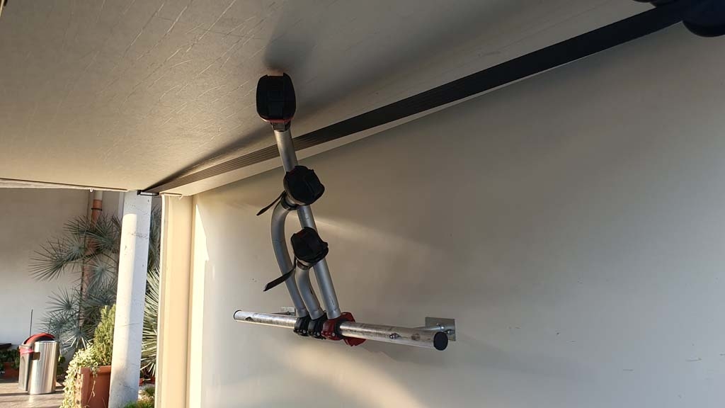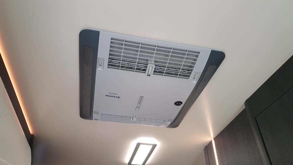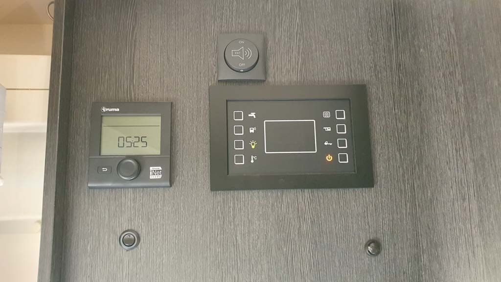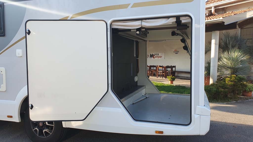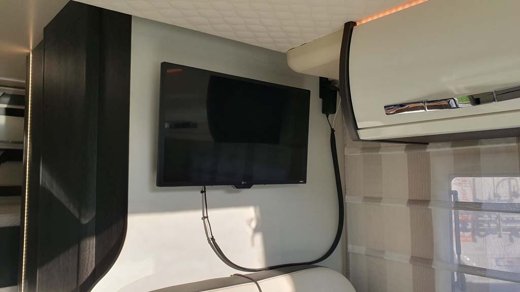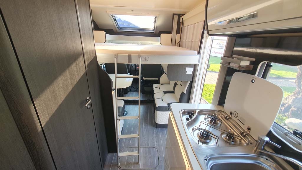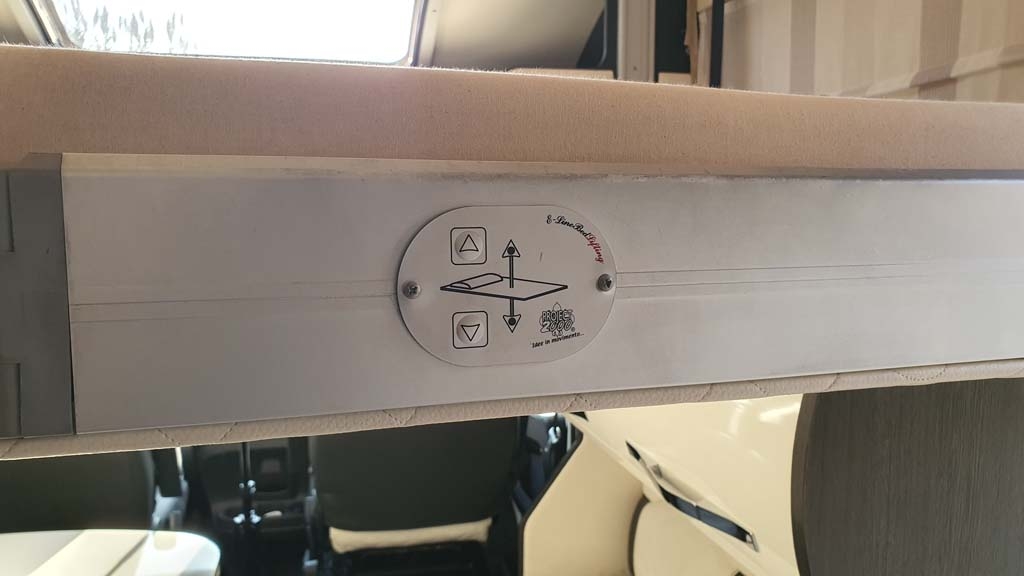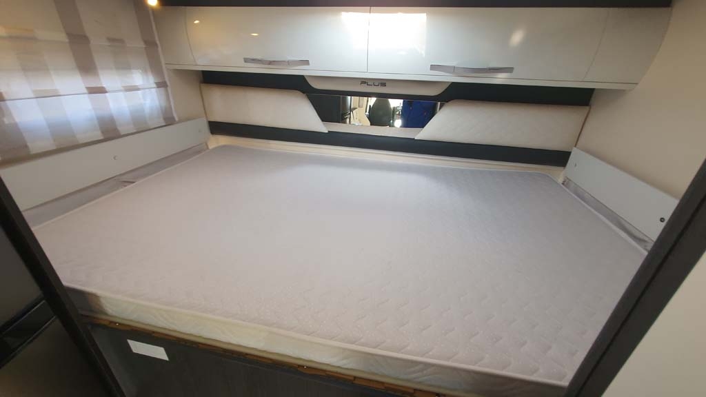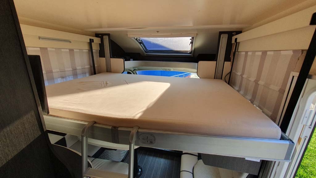 Nella parte posteriore si trova un comodo letto matrimoniale trasversale sopra l’ampio garage, perfetto per chi desidera praticità e spazio. Sopra la dinette, invece, il letto matrimoniale basculante elettrico scende in un attimo, offrendo due ulteriori posti letto sempre pronti.
