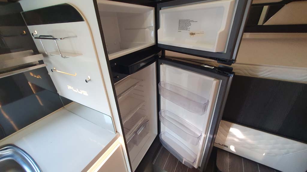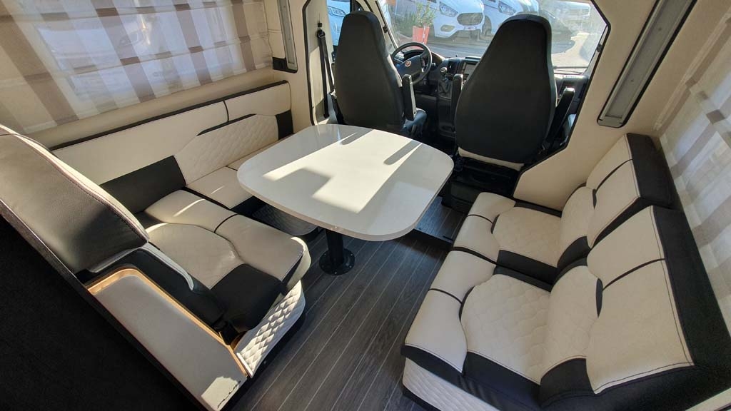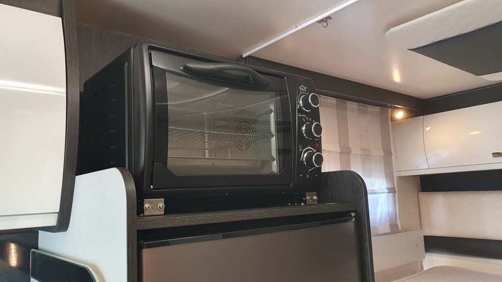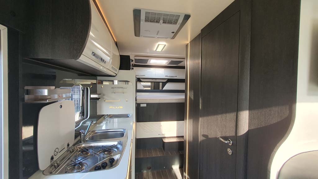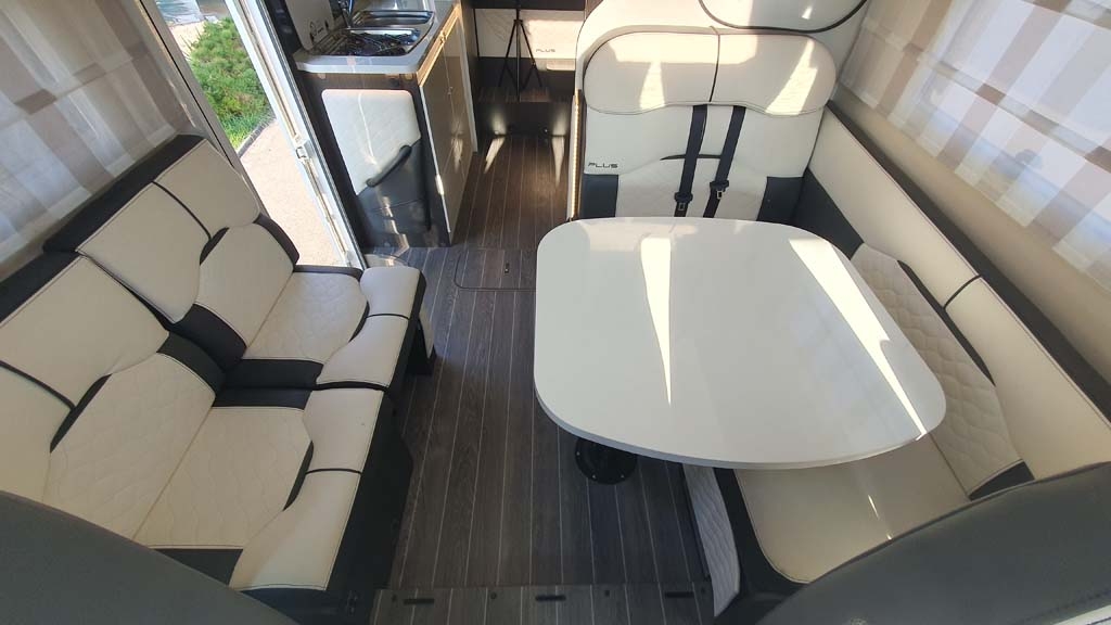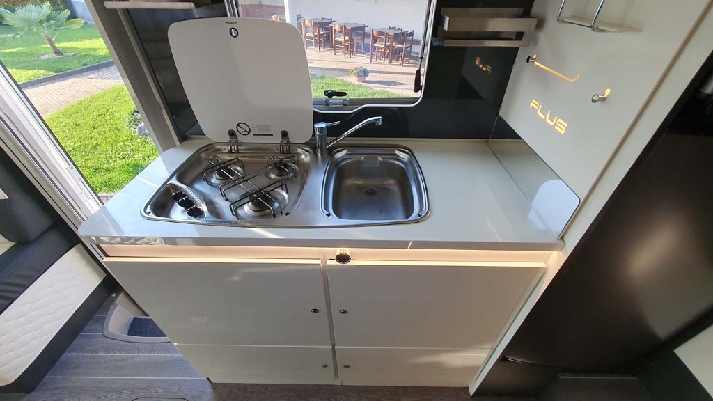La zona giorno è accogliente, luminosa e funzionale: la cucina è dotata di 3 fuochi, lavandino e un frigorifero trivalente da 145 litri, perfetto per conservare tutto il necessario anche nei viaggi più lunghi.