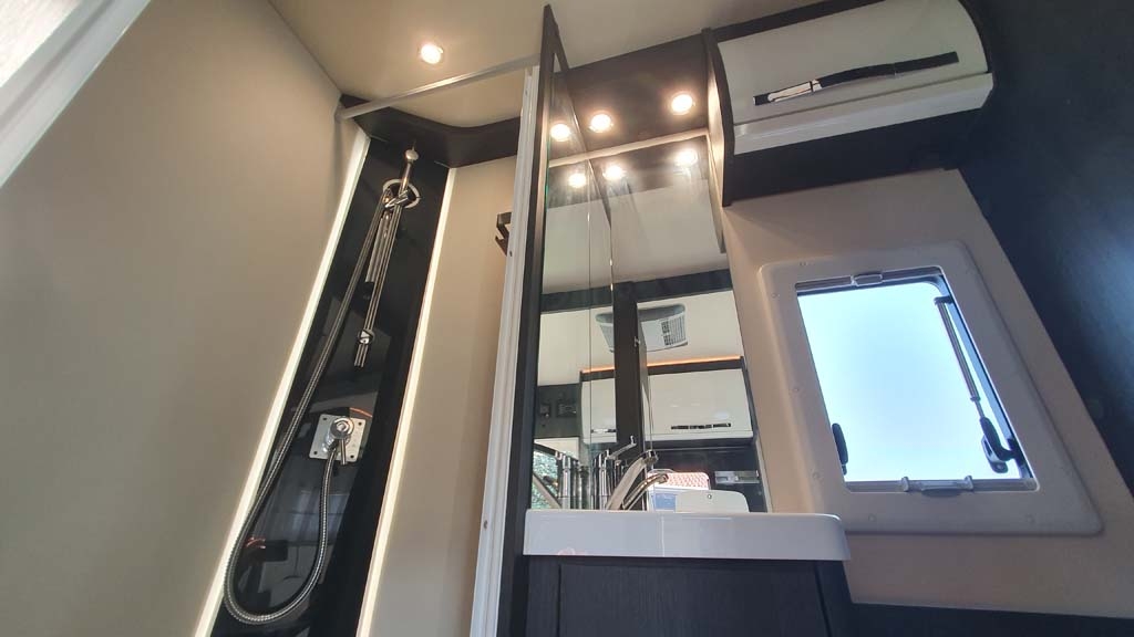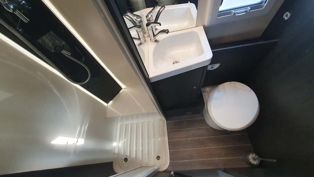Il bagno, spazioso e ben organizzato, ha la doccia separata, offrendo la comodità di una vera e propria zona relax anche in viaggio.