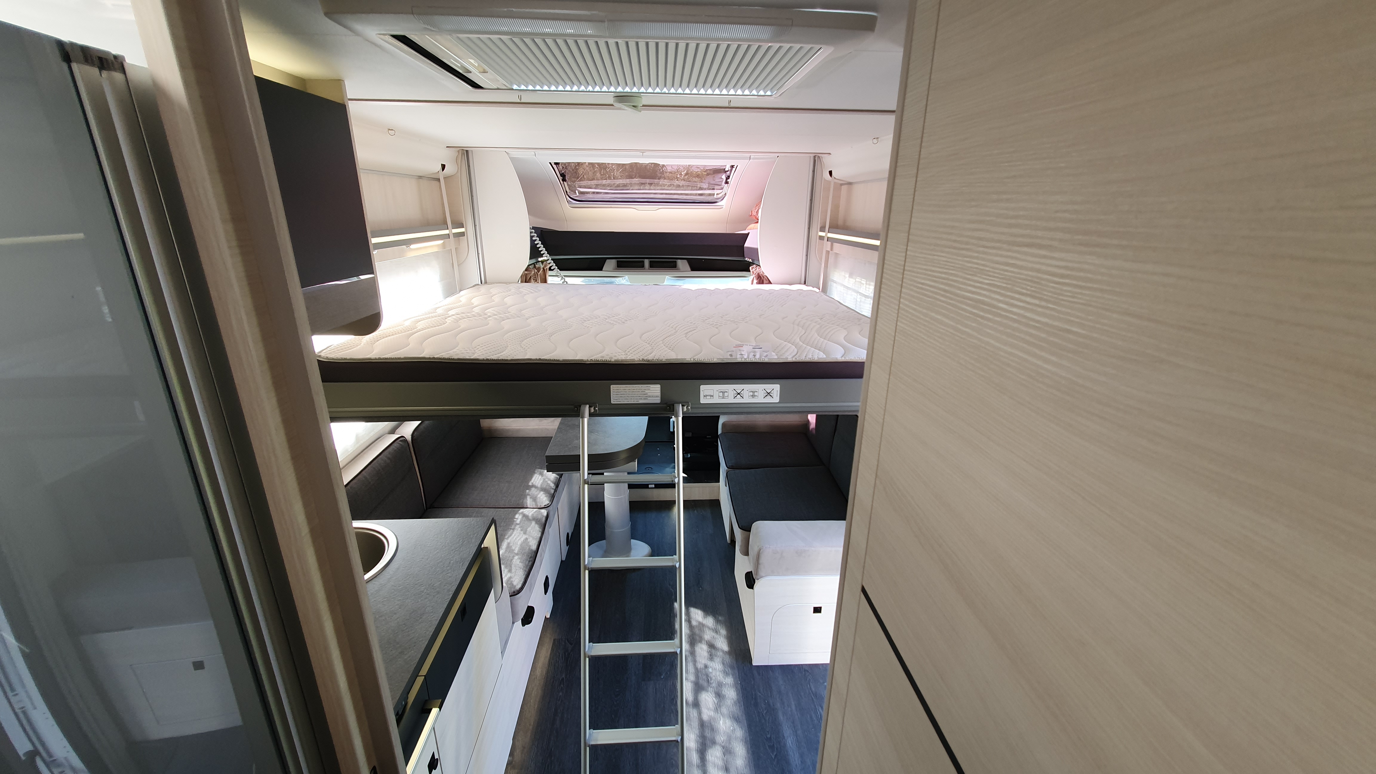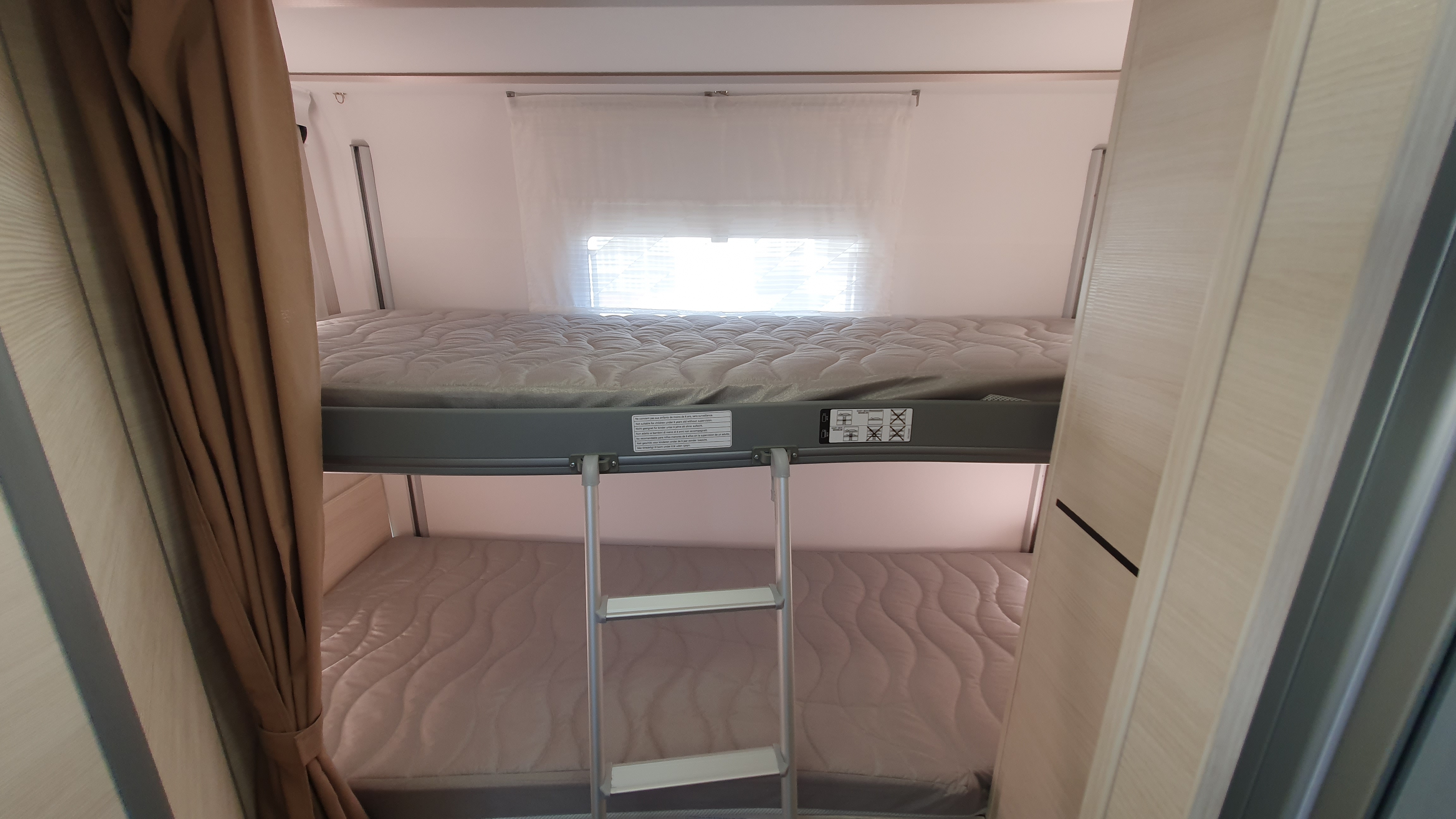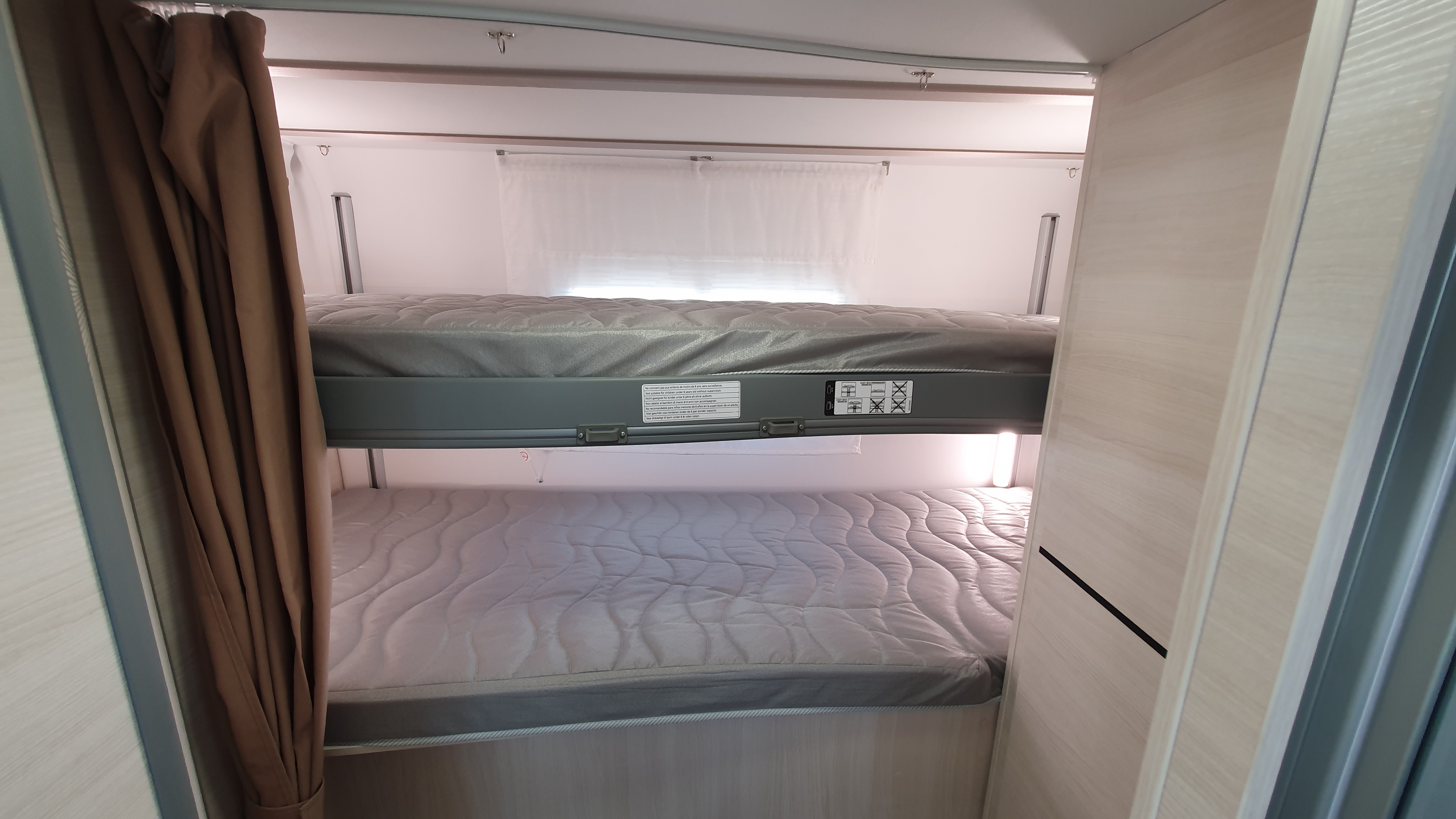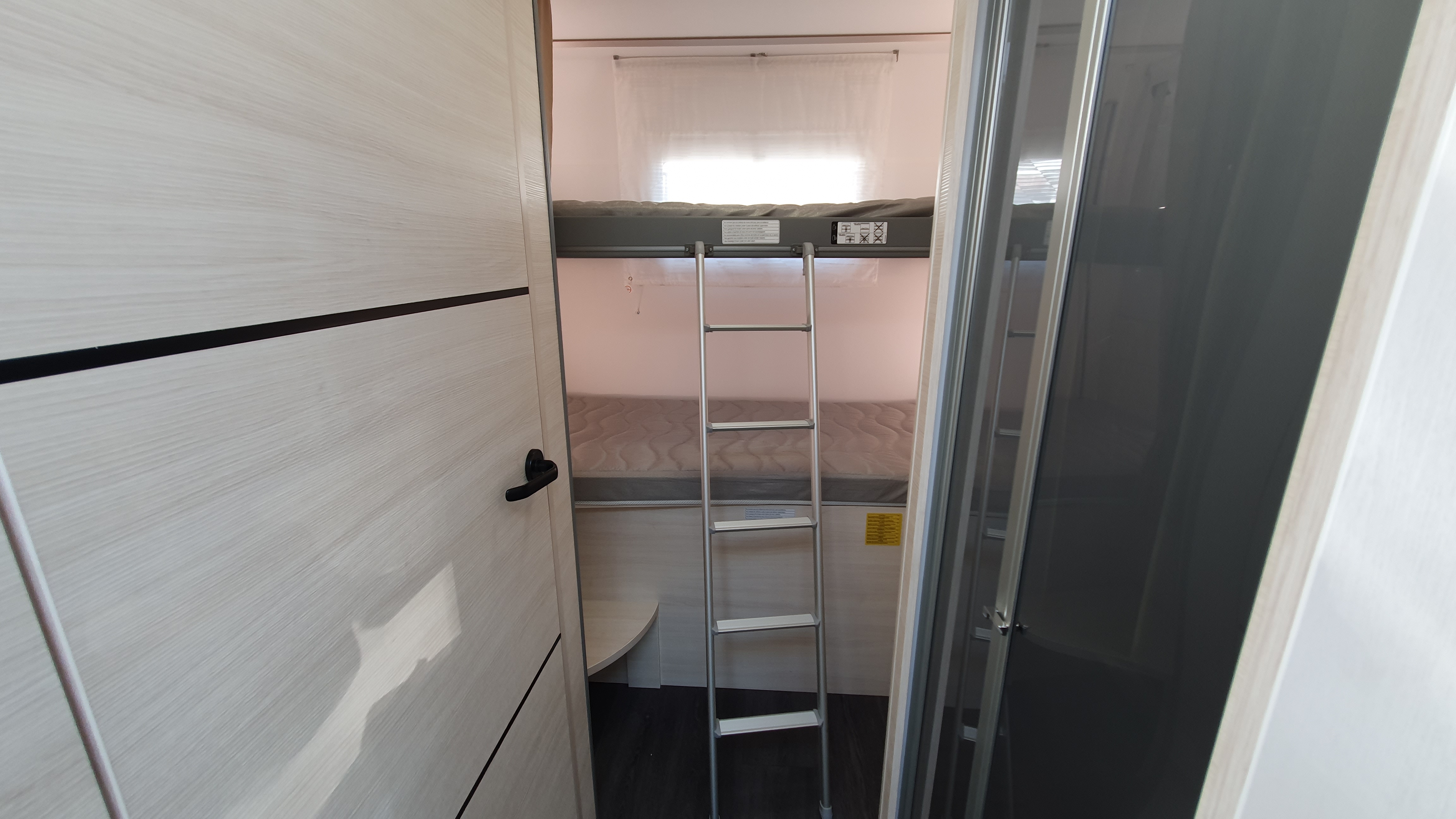 La disposizione interna è pensata per offrire spazio e funzionalità: il letto basculante sopra la dinette face to face e i letti a castello posteriori garantiscono comodi posti per dormire, mentre la dinette face to face crea una zona giorno ampia e accogliente.