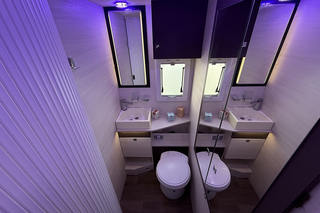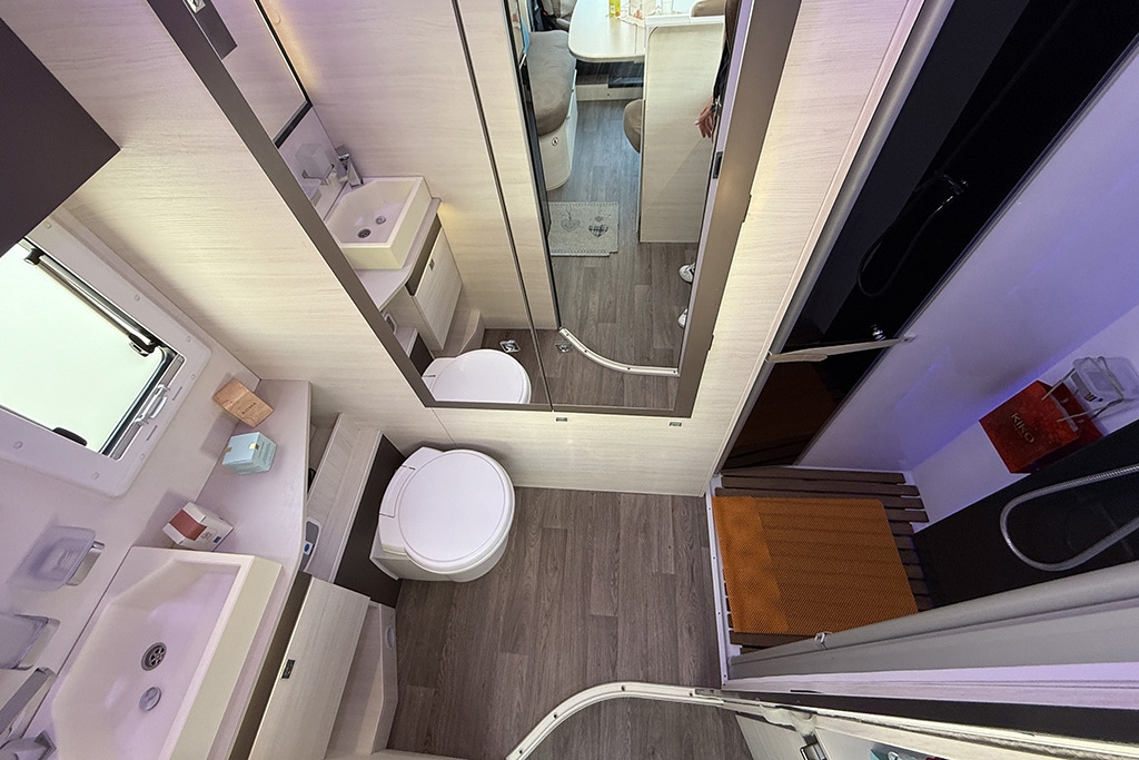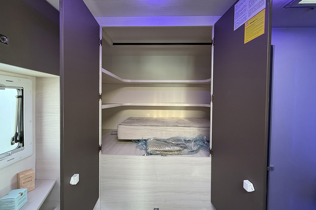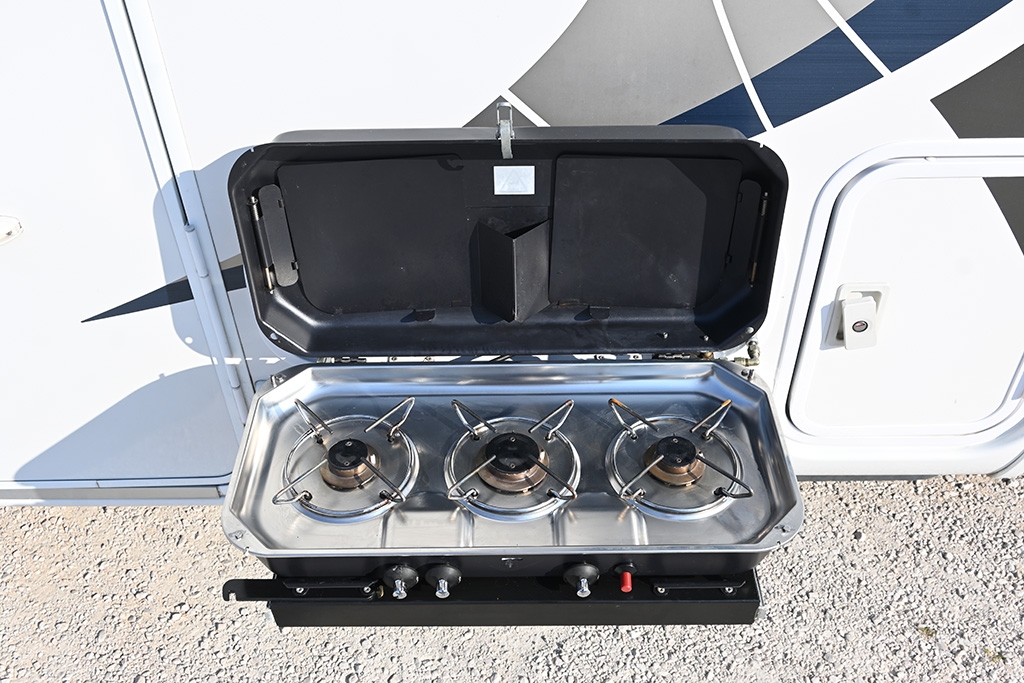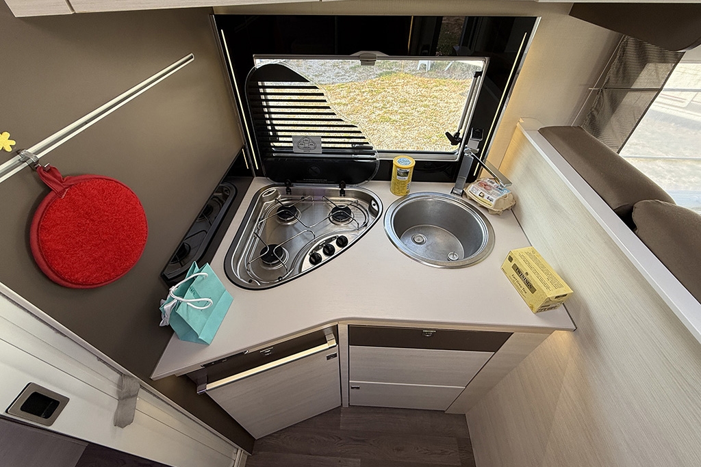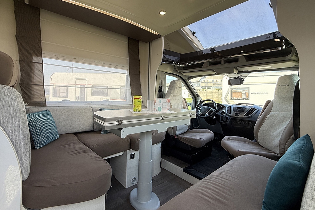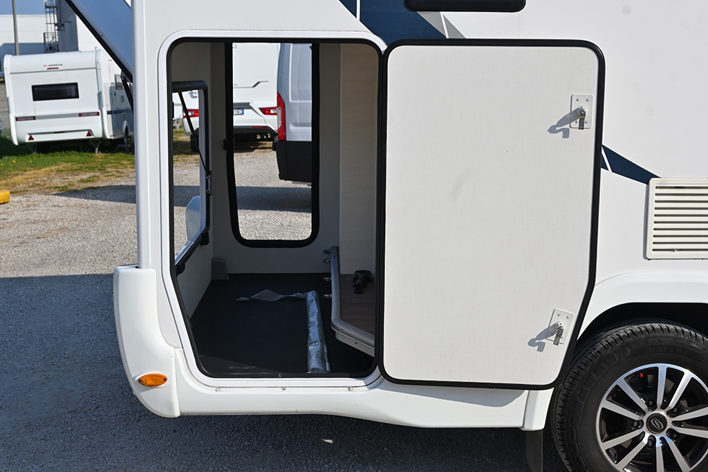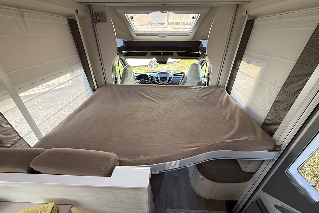 Climatizzatore in cabina, Cruise Control, Airbag passeggero, Specchietti retrovisori regolabili elettricamente e riscaldabili, Cerchi in lega da 16, Fendinebbia, Autoradio Ford con comandi al volante, Tendalino, Telecamera retromarcia, Cucina da campeggio esterna estraibile, Oscuranti plissettati in cabina, Cabina di guida color Grigio Scuro, Porta cellula con finestra, zanzariera e chiusura centralizzata, Luce esterna