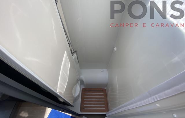 Piano cottura a 3 fuochi, lavello in acciaio inox e frigorifero con selezione automatica della fonte di energia, bagno con doccia separata, e nella parte posteriore letti gemelli con possibilità di trasformazione in matrimoniale con scaletta e, al di sotto, un guardaroba con binario estraibile, altri due posti letto ricavabili dal letto basculante elettrico sopra il soggiorno.