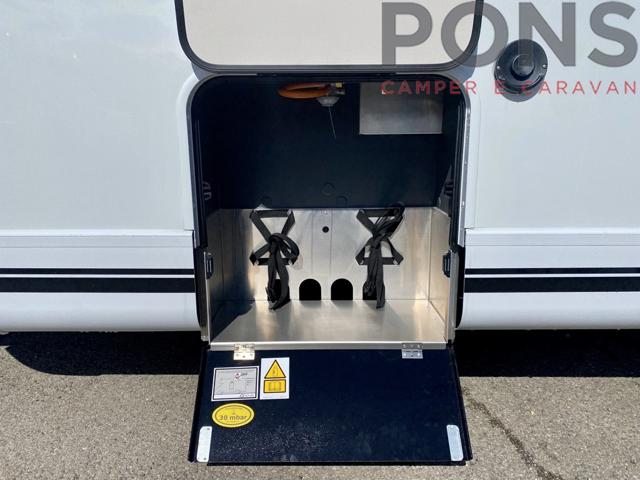 Nella parte esterna l'apposito vano per le bombole del gas e un ampio garage con piano ribassato, rivestimento antiscivolo, illuminazione, riscaldamento e binari con ganci fermacarico riposizionabili.
