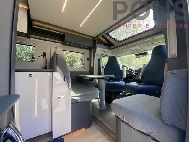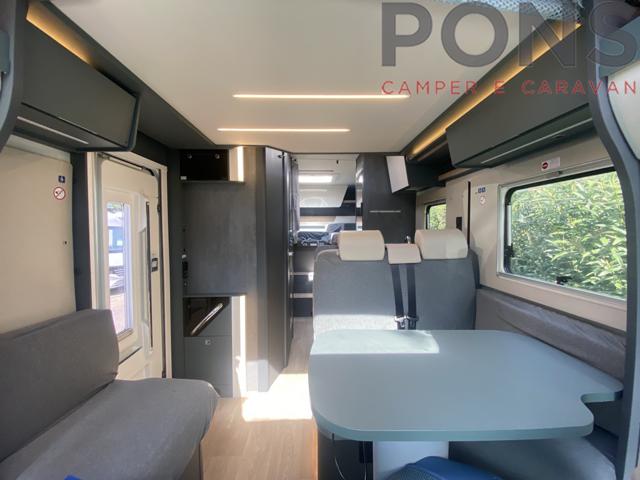 Nella sua lunghezza sotto i 7 mt questo bellissimo veicolo offre una luminosa zona giorno grazie al maxi oblò panoramico, dinette dotata di un tavolo ergonomico con piano traslabile anti-graffio e anti impronte, sedili cabina girevoli, numerosi pensili per lo stivaggio e un vano porta-scarpe all?ingresso.