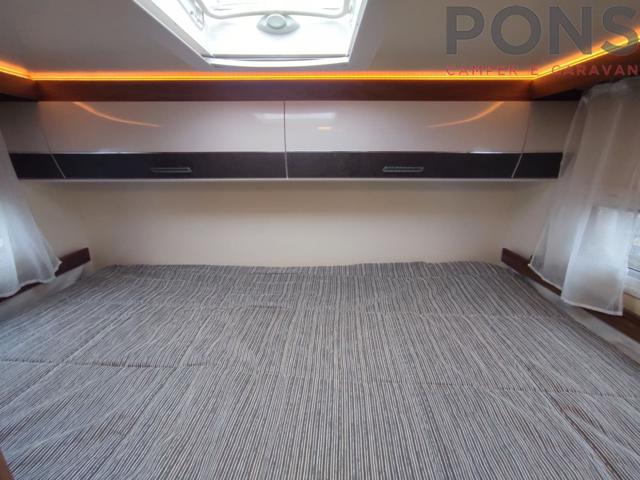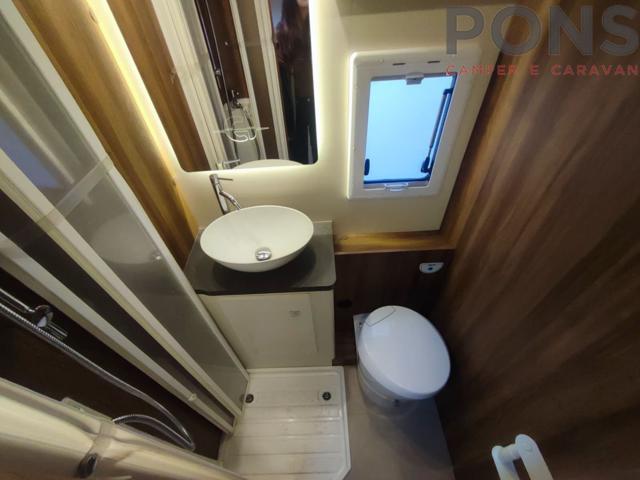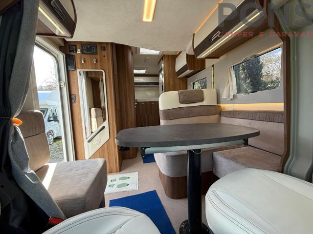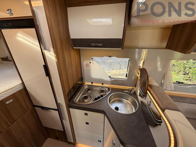 La pianta interna si sviluppa con una luminosa e confortevole dinette con sedili cabina girevoli. La cucina, collocata sul lato sx, ospita lavello, piano cottura a tre fuochi e capiente frigo a colonna sul lato.