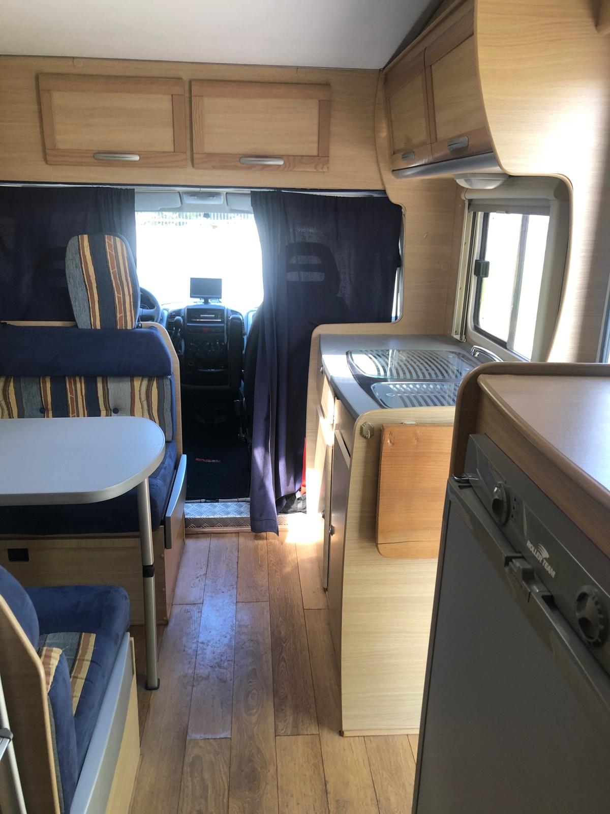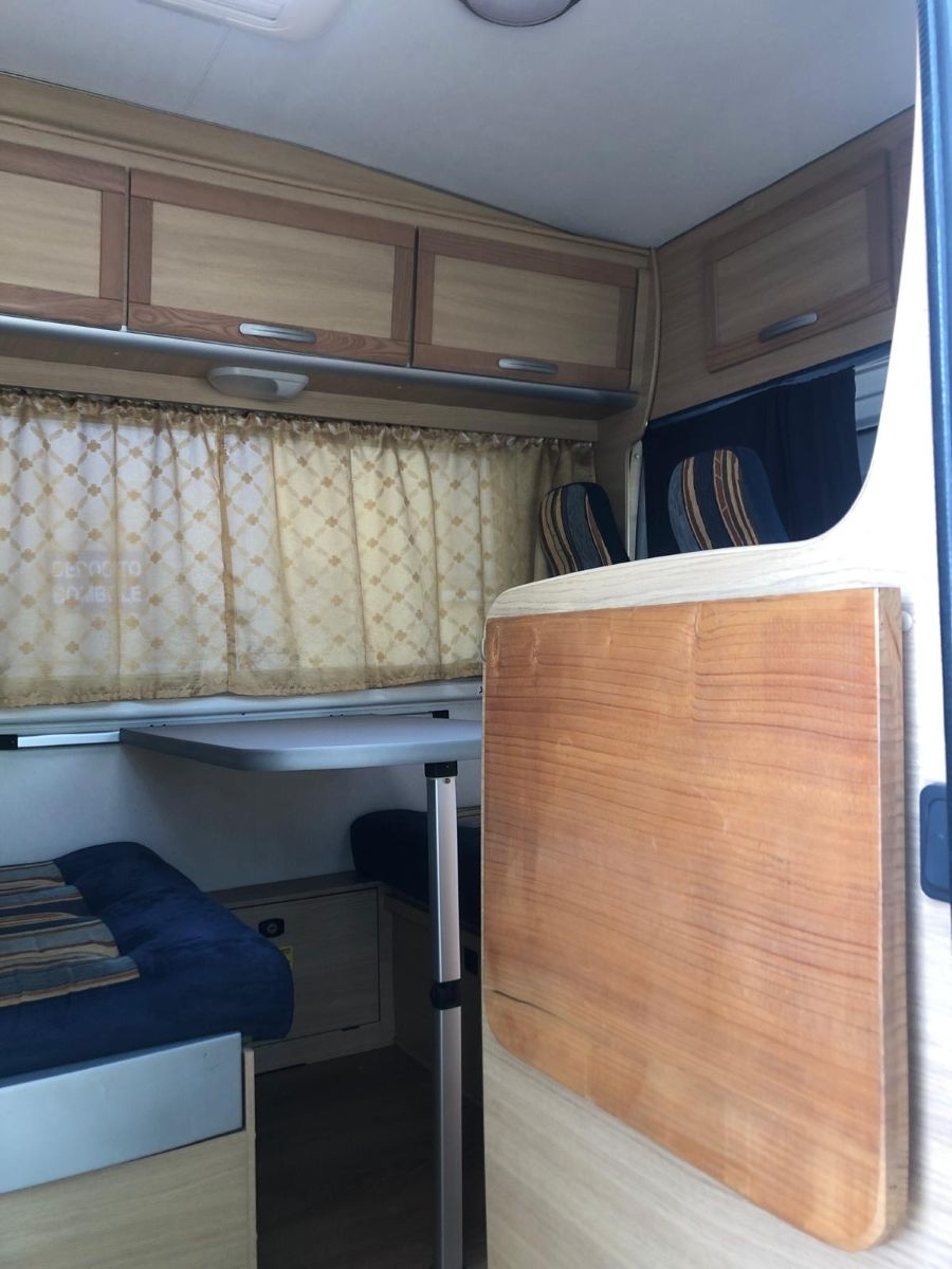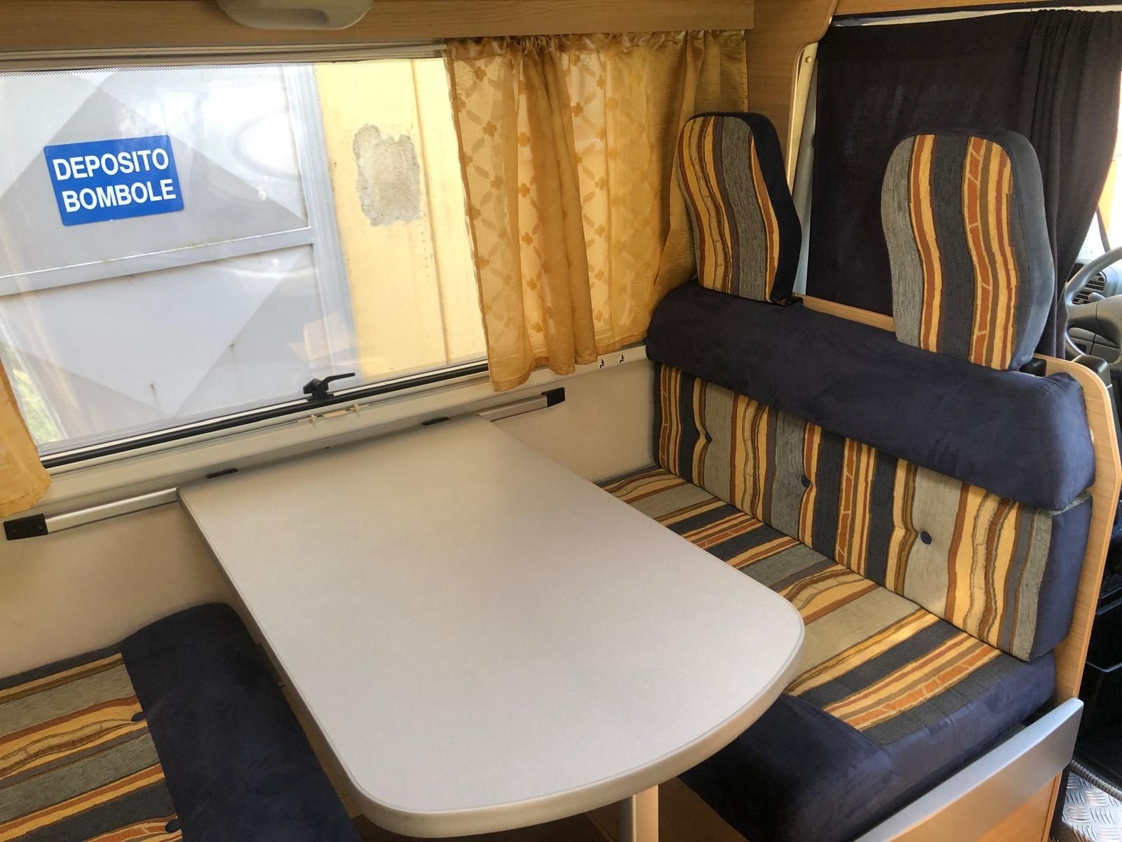 Semintegrale con ampio garage con una buona abitabilità interna, omologato 4 posti letto/viaggio, dinette a 4 posti frontali trasformabile in letto matrimoniale, letto matrimoniale su garage. Bagno con doccia separata, riscaldamento a gas Truma Combi, cucina a tre fuochi e frigorifero da 110 litri.