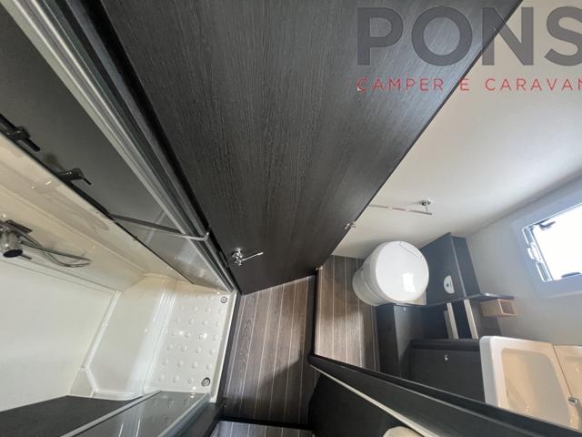 Piano cottura a 3 fuochi, lavello e frigorifero a colonna, bagno e doccia separati in due ambienti distinti e nella parte posteriore letti gemelli con possibilità di trasformazione in matrimoniale, altri due posti letto ricavabili dal letto basculante elettrico sopra il soggiorno.