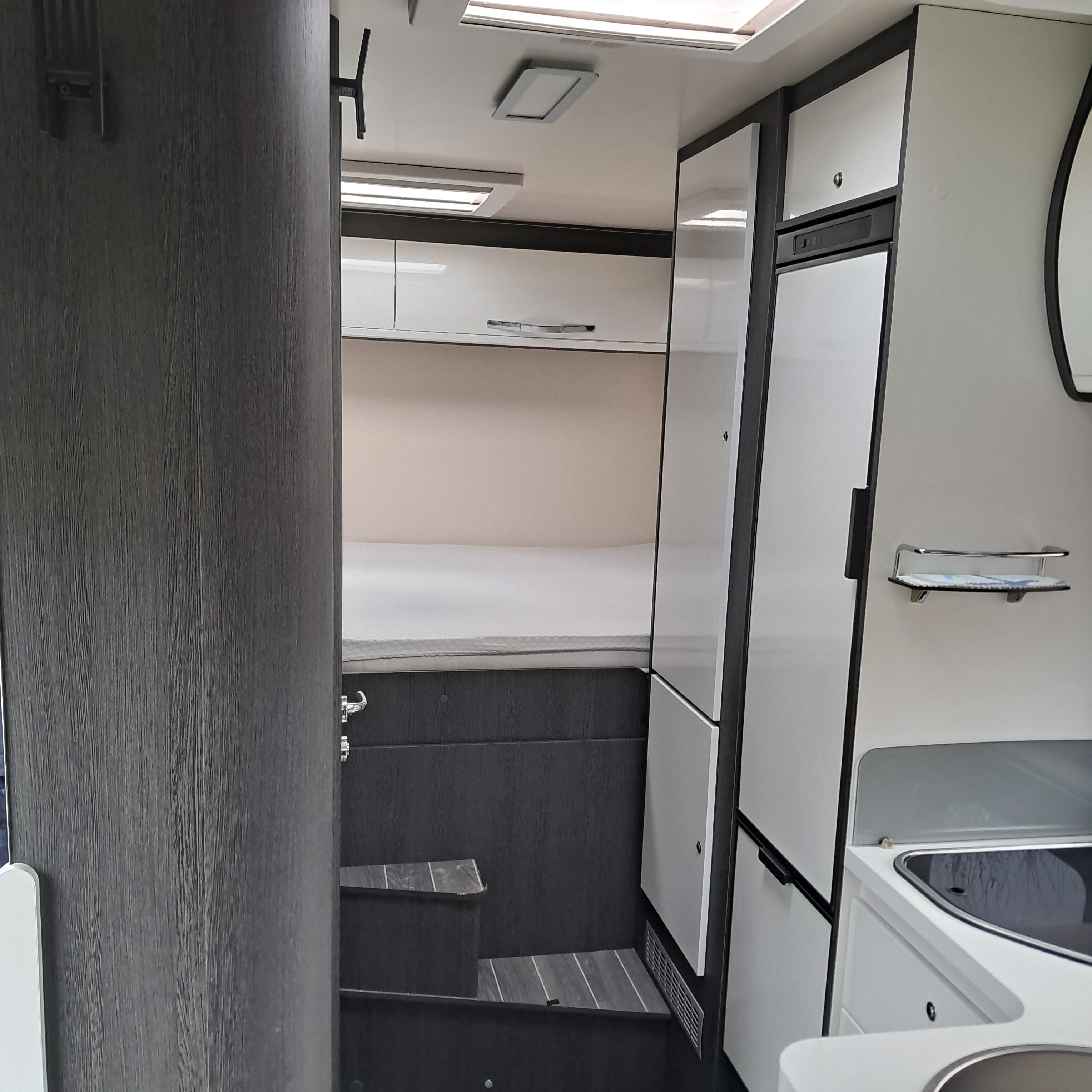 Semintegrale con letto matrimoniale nel basculante, semidinette affiancata da divanetto laterale nella zona anteriore, cucina ad L e bagno con doccia separata nella zona centrale e grande letto con sottostante gavone garage regolabile in altezza nella zona posteriore.