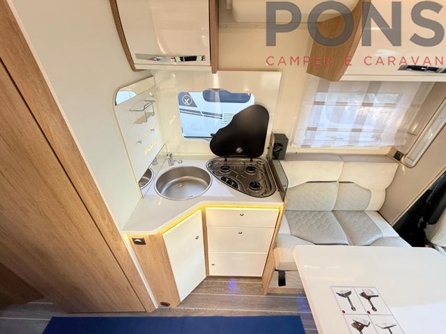 Lungo 7,45 mt con letti gemelli in coda e letto basculante sopra la dinette, cucina con piano cottura a tre fuochi, zona giorno ampia e luminosa con tavolo a libro e dinette face to face. Bagno con doccia separata e garage posteriore spazioso.