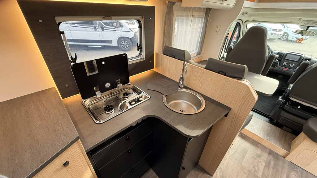 La cucina a gas è completa di due fuochi, lavandino e frigorifero trivalente da 150 litri, perfetta per preparare ogni pasto anche in viaggio.