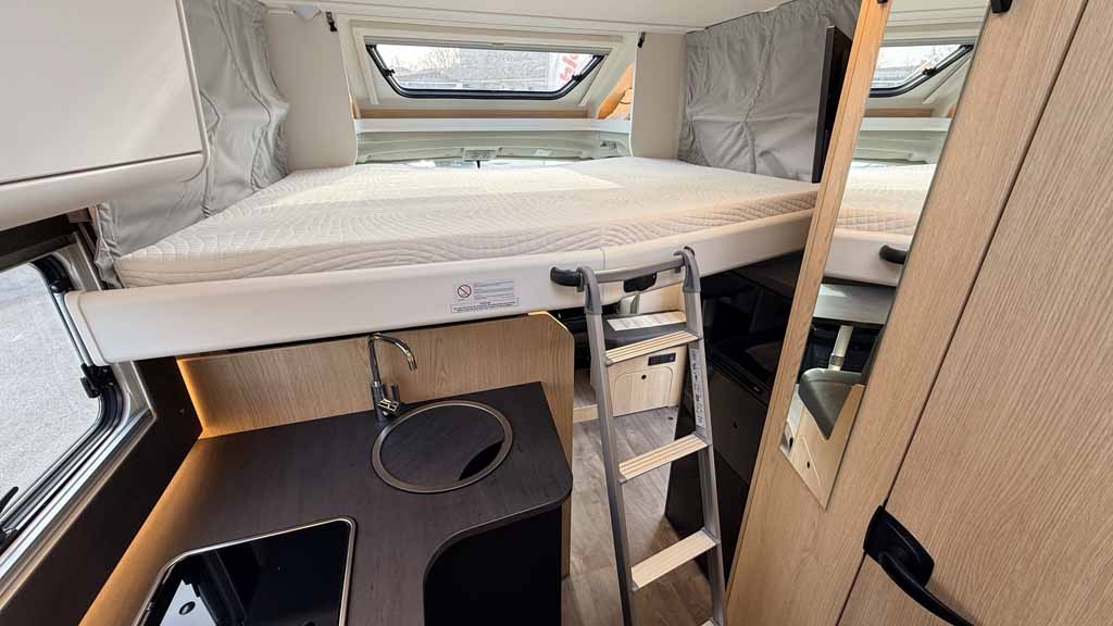 un letto matrimoniale basculante manuale si trova sopra la dinette, mentre nella parte posteriore ci sono due letti gemelli sopra al garage.