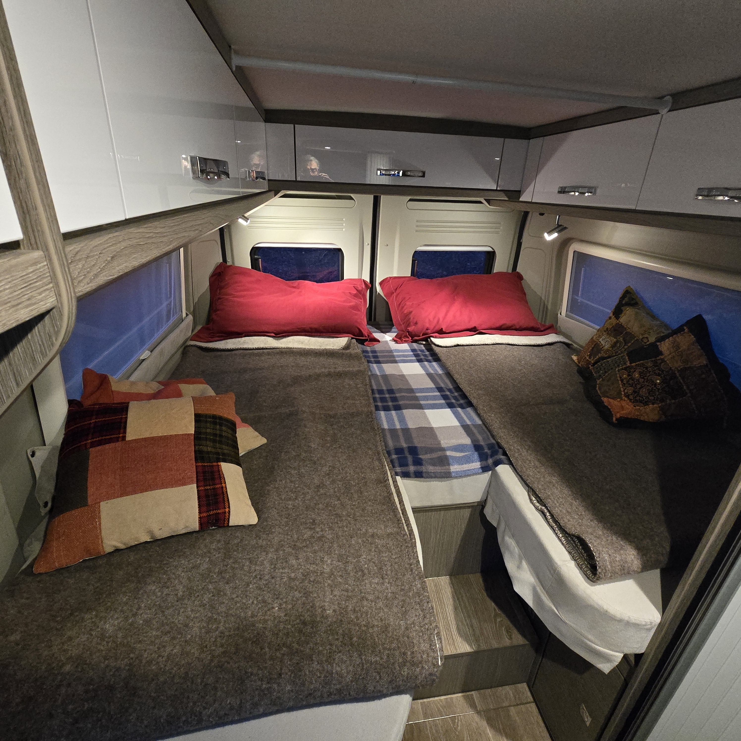 Veicolo con interno Elegance ; Pacchetto ALL-IN; Tapezzeria MARAIS; Sensore pneumatici ; letti gemellati; Tetto soffietto con 2 posti letto; Estensione terzo (5°) letto con tavolo alternativo ; Comando Truma Cp plus Truma Combi diesel ; Frigorifero compressore DOMETIC