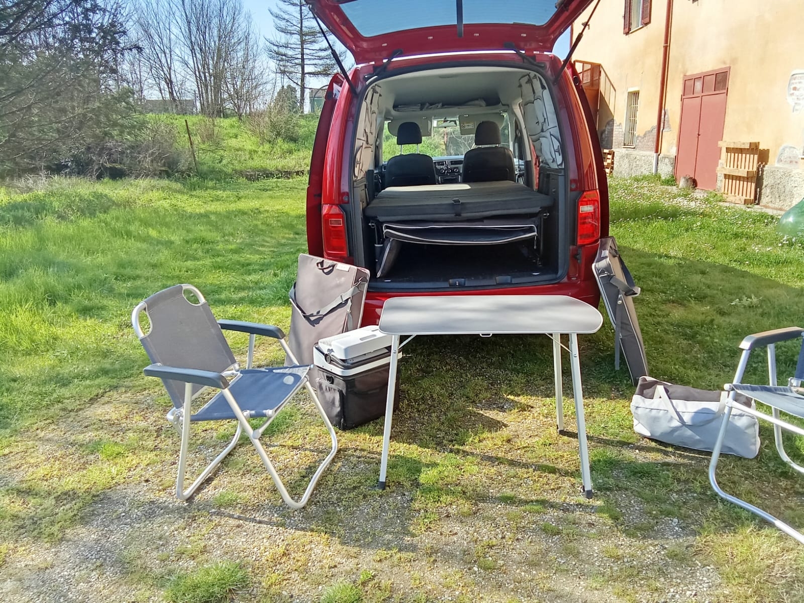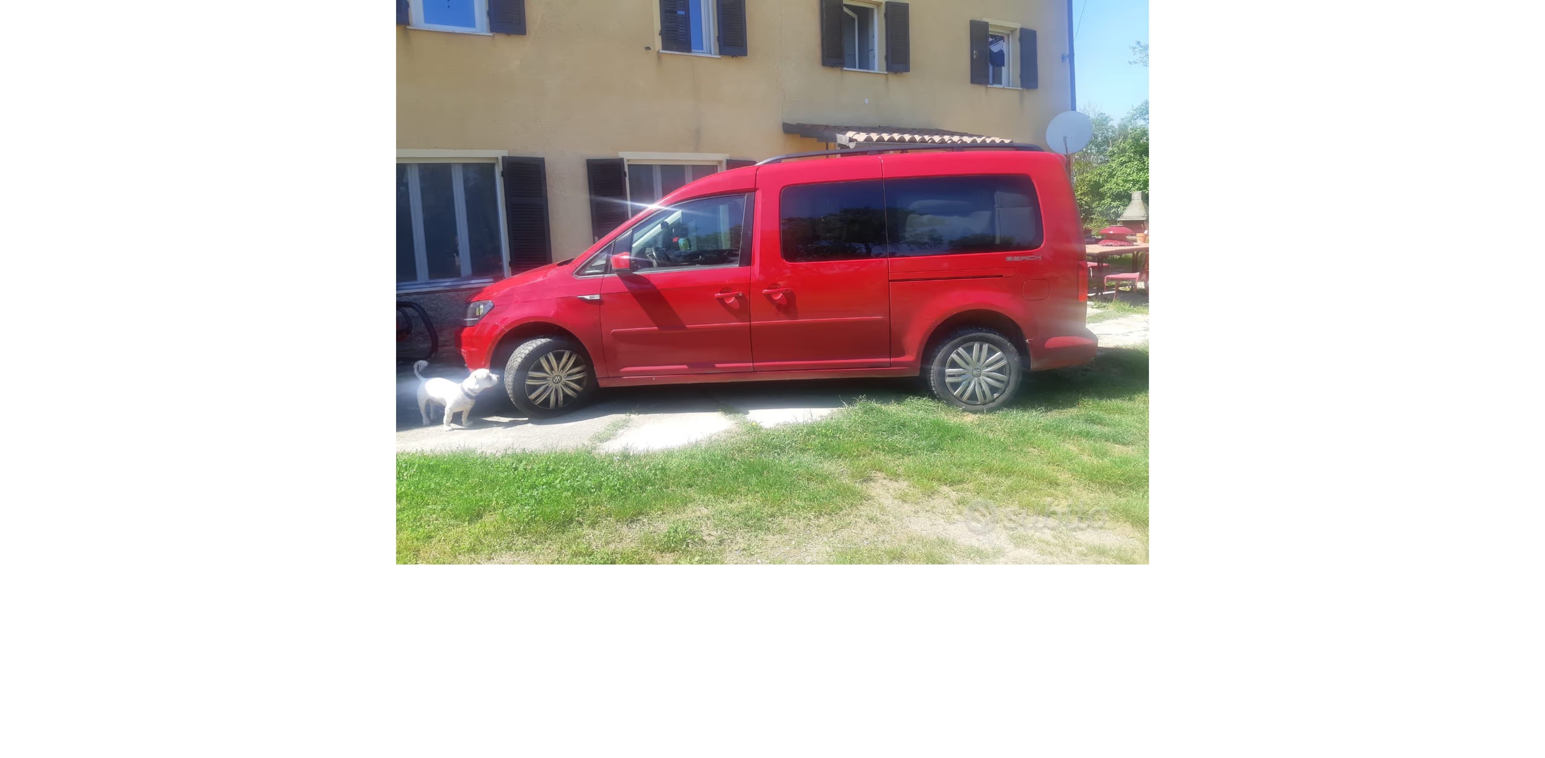 letto posteriore originale integrato 200 cm ideale per due persone, veri posteriori oscurati e tendine originali per tutti i vetri, gavoni armadio laterali originali, sedie e tavolino originali posizionati tra i sedili e sotto il letto, tenda da montare nell'ampio portellone originale, frigo portatile originale. Climatizzaore, radio, carica telefoni,luci lettura anteriore e posteriore, chiusura centralizzata, filtro anti polline, copertura antisfondamento a finestrino aperto, gancio blocco portellone semiaperto peer sosta notturna fuori campeggio. ABSe ESP, air bad frontali e laterali, attacchi ISOFIX per seggiolini, frenata automatica di emergenza front assist, Cruise control, vetri elettrici, aria condizionata, trazione anteriore, cambio manuale a sei marce, sensori parcheggio. Colore rosso interni neri in stoffa.