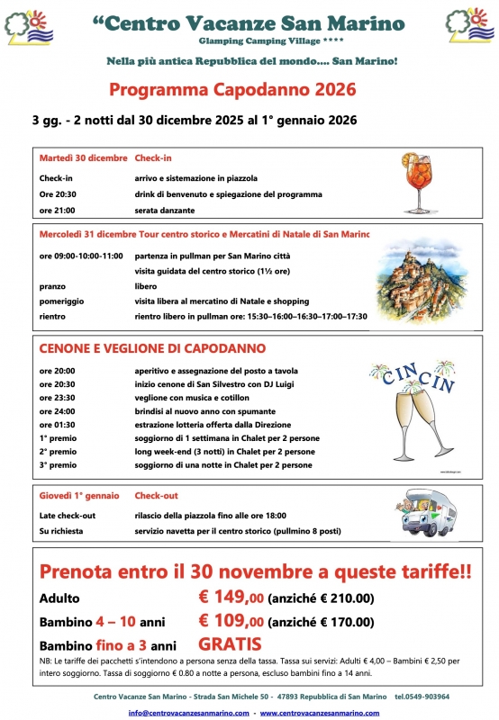 Drink di benvenuto, serata danzante, tour del centro storico e dei mercatini di Natale di San Marino, cenone e veglione di San Silvestro, e late check-out l'ultimo giorno: un programma con i fiocchi!