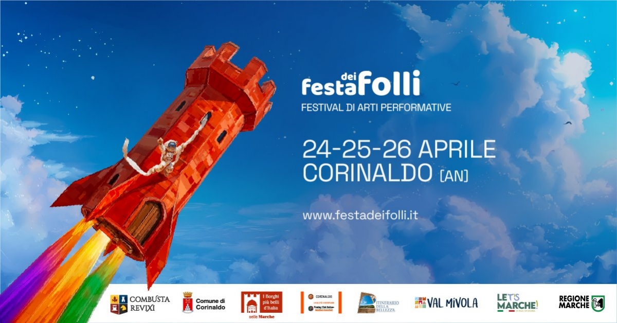 Dal 24 al 26 aprile 2026 a Corinaldo (AN) torna la Festa dei Folli, tredicesima edizione. In programma spettacoli di teatro di strada, circo contemporaneo, concerti e dj set.
