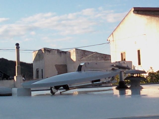parabola in posizione chiusa poggia su un scatola di plastica che sopra ce della gomma che attutisce le eventuali vibrazioni non necessario