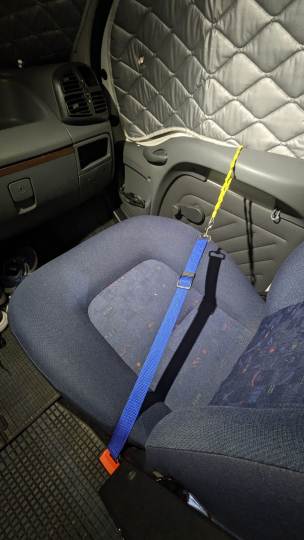 per aumentare la sicurezza durante le soste notturne in libera ho ideato questo sistema di blocco delle porte dall’interno: una cintura di sicurezza per cani (si trova in molti siti e-commerce, come Aliexpress) alla quale aggiungere una catenella gommata, da girare intorno alla maniglia della porta.