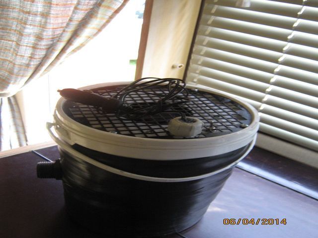 Elemosino da mia moglie un pezzo di stoffa, plastificata da una parte e stoffa dall'altra, per rivestire il bidone in modo tale da avere meno dispersioni. Metto la parte plastificata verso l'esterno. Ed ecco ho fatto una porcheria con sta stoffa siliconata al bidone... perchè mia moglie non aveva tempo... risolvo rivestendo tutto il bidone, a parte il fondo,con del nastro isolante che quasi non incollava più. Silicono con acetico tutti gli spifferi. Lo faccio funzionare a tratti per 2 giorni con profumo all'interno per eliminare l'odore dell'acetico... ed ora rimane da fare il test. Riempio con quello che ho in formato ghiaccio l'interno del bidone (ghiaccioli da campeggio 2, bottiglia mezzo litro 1) e devo dire che per un bel pò di tempo abbiamo avuto un carino ricircolo d'aria fresca.