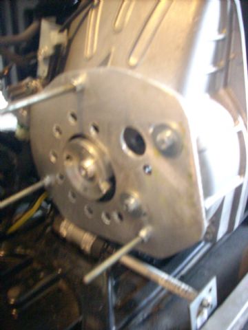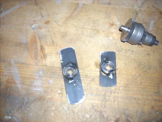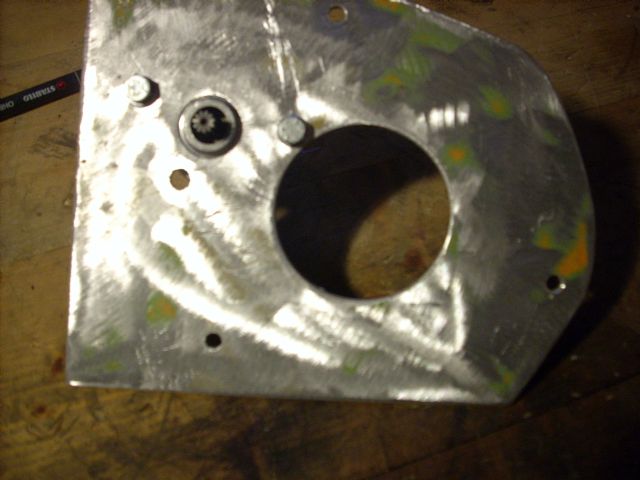 Ho creato due nuove piastre in alluminio le quali sono state montate una frontale all’altra, su quella anteriore è stato fatto un foro in modo da far passare il distanziale che collega l’albero motore del generatore con la corona dove ingrana il pignone durante la fase di avviamento, ho comprato due cuscinetti con foro interno uguale al diametro dell’albero del pignone (8 mm) altezza 5 mm e diametro esterno 22 mm , questa misura è giusta per lo spazio che c’è tra la corona dentata del gruppo pignone( quella che ingrana con l’albero del motorino d’avviamento) e la piastra,questo spazio nel primo progetto era stato chiuso con delle rondelle le quali reggevano il tutto, ho saldato i cuscinetti su due pezzi di piattina, alle quali ho praticato due fori alle estremità in modo da fissarle sulle piastre, tagliate in due misure diverse ( due spazi diversi sulle piastre dove andavano fissate ) una più corta alla quale è stato fatto un foro centrale dove è stato inserito e saldato il cuscinetto , questo è stato necessario per rimanere bassi in quanto lo spazio era giusto per lo spessore del cuscinetto, che ho posizionato nella parte inferiore tra corona e piastra,e una più lunga su cui è stato saldato l’altro cuscinetto ed è stata posizionata nella parte superiore ( piastra frontale), in questo modo tutto il gruppo del pignone ruota nei cuscinetti i quali fanno anche da fermo.