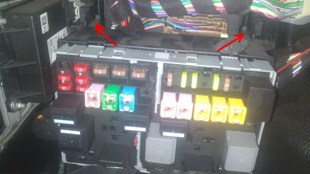 Premere con le dita le linguette indicate dalle frecce e ribaltare in avanti la scatola per accedere al Body Computer. Devo dire che Ford da questo punto di vista è un passo avanti: oltre all'estrema cura nei cablaggi e la loro organizzazione, per fare tutto il lavoro non c'è bisogno di svitare neanche una vite! Tutto è accoppiato alla perfezione con robusti ed efficaci incastri.