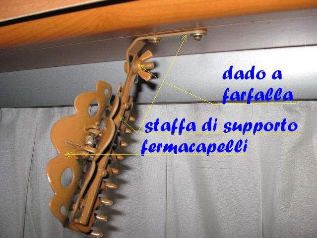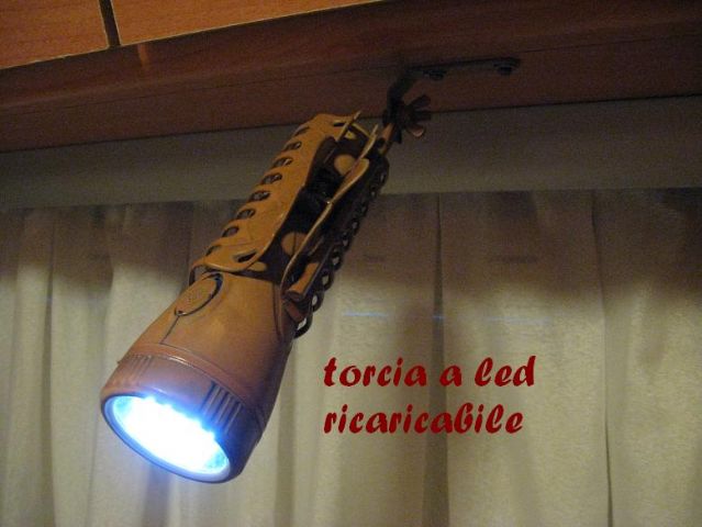 Per non alterare l'impianto elettrico esistente nel camper, ho creato una staffa di supporto per una torcia a led, con ricarica a 220 V, utilizzando due staffe metalliche, un bullone con dado a farfalla, e per regolare l'inclinazione e un fermacapelli per signore.