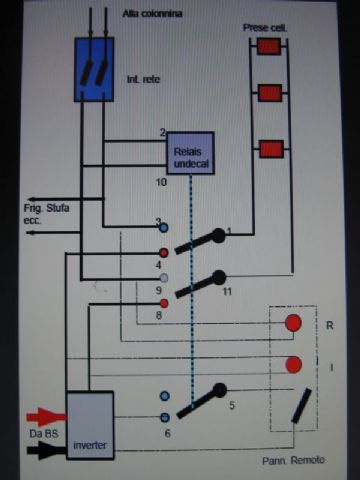 Detto cio' basta sostituire il relais octal con relais undecal (non e' una parolaccia)ma semplicemente e' lo stesso tipo di relais a 11 piedini anziche' 8 (3 scambi invece che 2), ed utilizzare un contatto normalmente chiuso dello scambio che resta libero da inserire in serie all'interrutore remoto dell'inverter... e il gioco e' fatto.