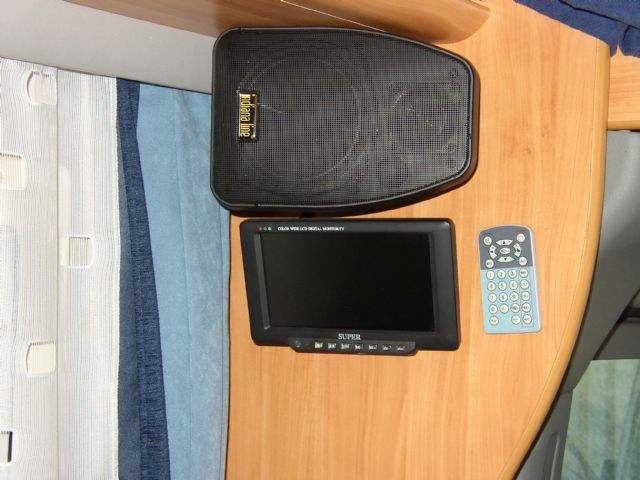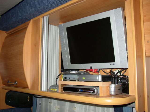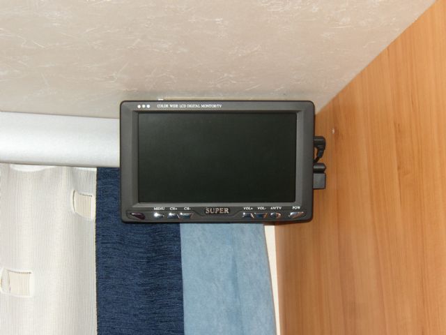 Ho montato un monitor di fronte alla panca. Visto che sono appassionato di impianti audio e video ho montato anche altri monitor sul camper: uno nel porta TV da 15 pollici, uno da 7 in dinette, un'altro in camera, uno sulla plancia del cruscotto e uno da 10 pollici esterno alla cellula, dopo che mi sono fatto montare uno sportello tipo Thetford dal mio concessionario di fiducia.