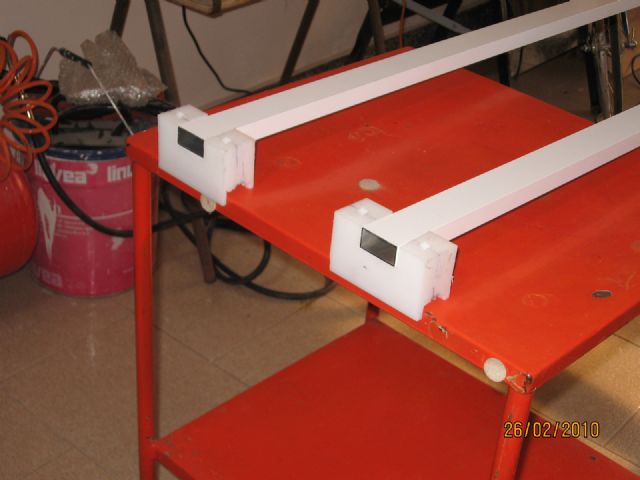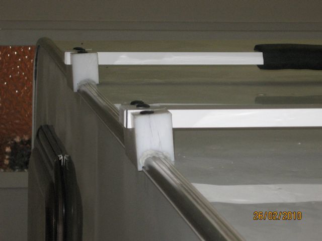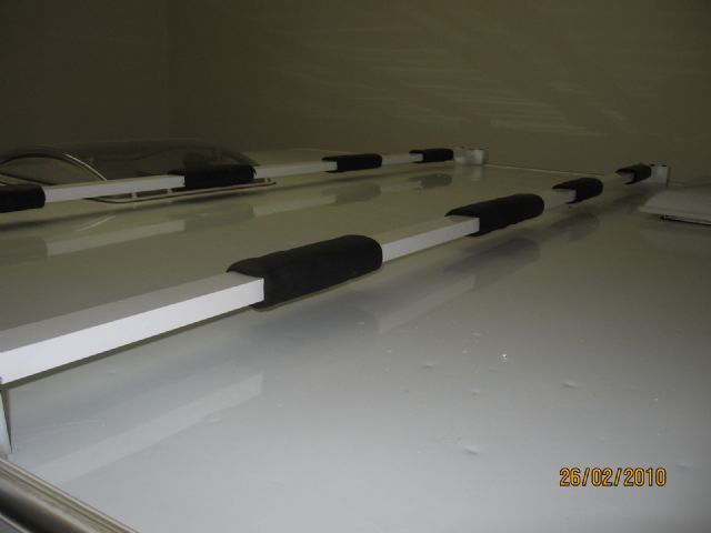 Ho realizzato due barre portatutto con poca spesa. Ho acquistato una fascia di alluminio bianca di sez. 2x4 €15, poi ho acquistato una barra di un metro di nylon bianco (€15) per fare i supporti da poggiare sul profilo in alluminio che congiunge il tetto alla fiancata. Dopo di ciò ho tagliato 4 pezzi di nylon per fare i supporti che ospiteranno le barre, li ho sagomati secondo il profilo di alluminio del camper e al centro ho eseguito uno scasso per ospitare la barra, poi alla due estremità del supporto due buchi per fissarlo sul bordo di alluminio come si montano i portapacchi. Ho rivestito a tratti le barre di materiale coibentante che usano in idraulica che comunque non toccano per niente il tetto, dopo di ciò ho montato una lastra di alluminio mandorlato avuta da un rottamaio e con 4 bulloni e dadi l'ho fissata sulle barre, quindi sulla piastra ho fissato l'antenna TV e volendo anche l'antenna del CB. Resta anche molto spazio per fissare il pannello solare. Certo si può migliorare avendo più tempo a disposizione